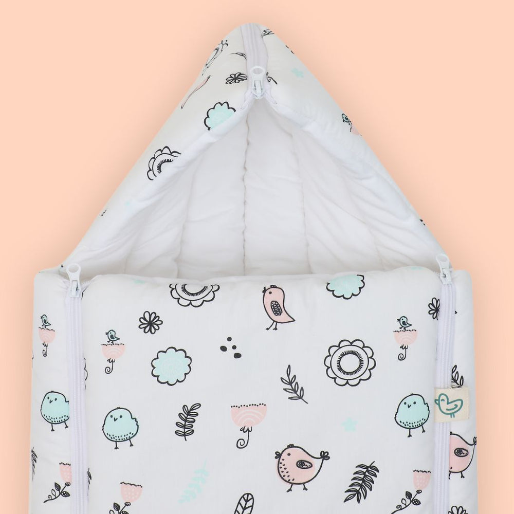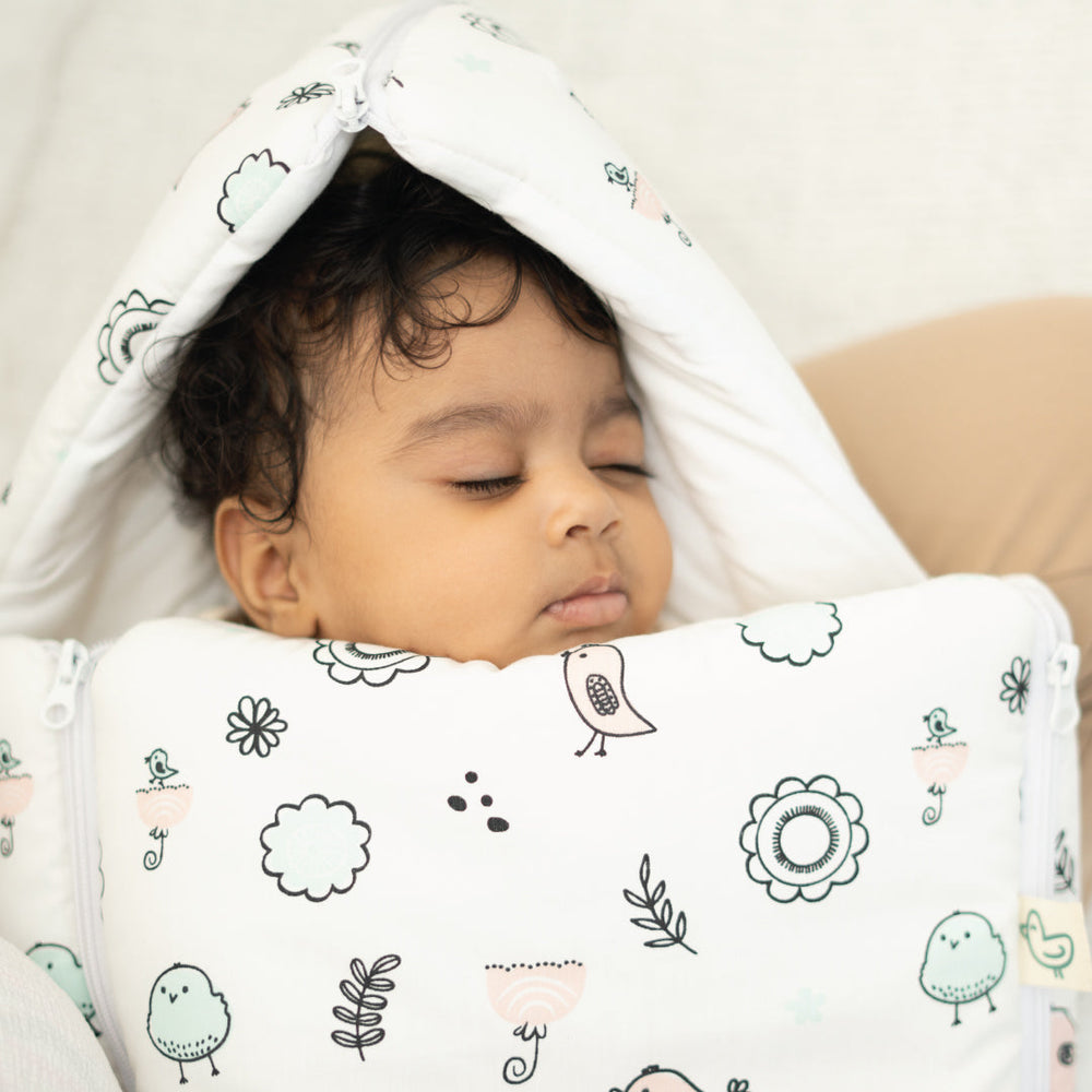 Made of 100% Organic cotton on the outer layer and 100% cotton fabric inside (Poly Fibre filling) this carry nest helps to hold your newborn with ease & comfort and provides adequate warmth. It is multi-functional. A zip runs along the nest for easy access.