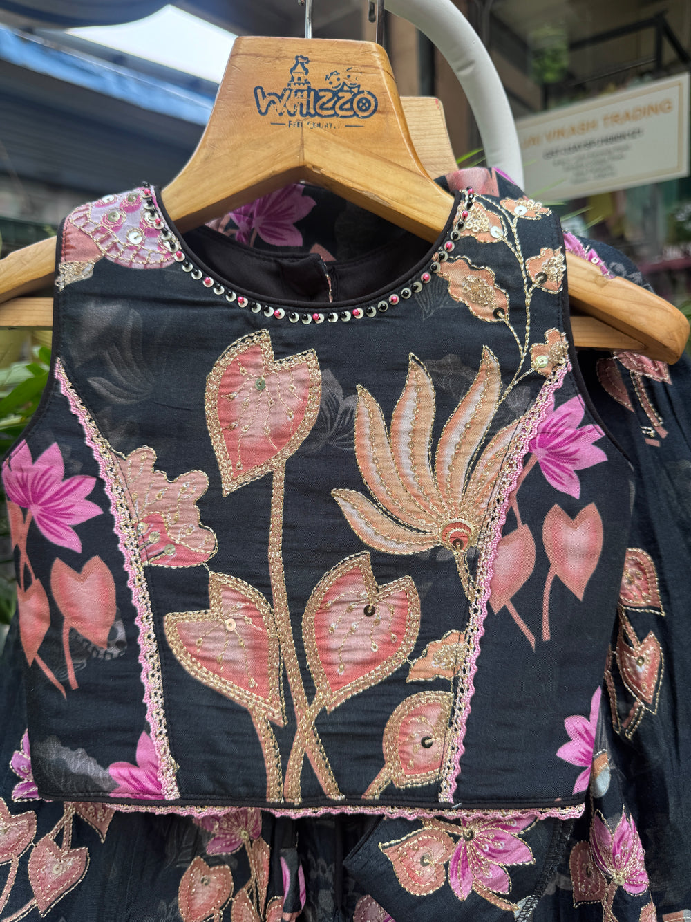 A stunning blend of grace and glamour, this Black Floral Embroidered Lehenga Choli is designed to make your little girl stand out effortlessly at any celebration. The sleeveless choli features rich multi-thread embroidery with lotus and leaf motifs, adding a luxurious touch to the classic black base.