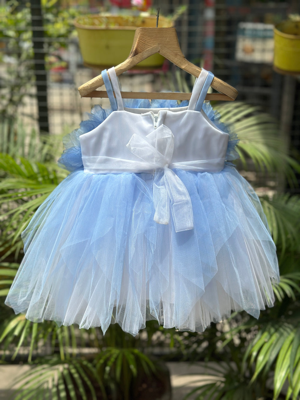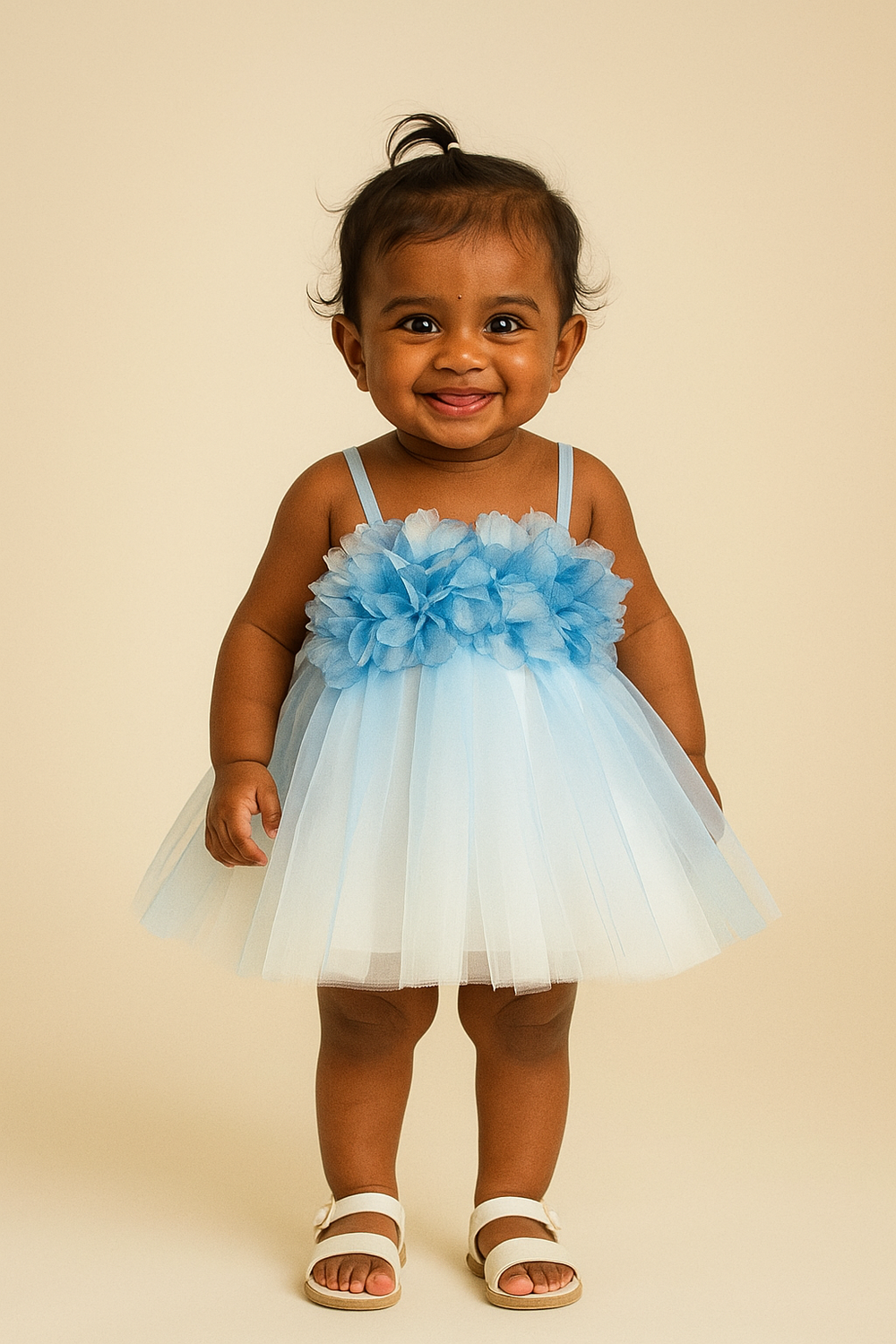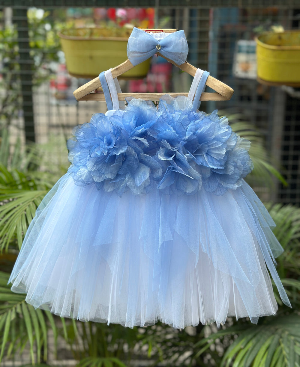 Fluffy floral detailing on the chest and a flowy tulle finish make this dress an instant favorite. Light, breezy and perfect for warm-weather events.