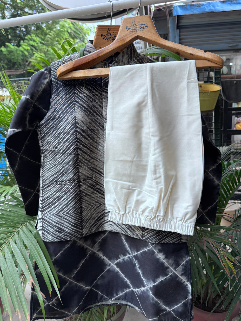Understated yet striking — this black kurta set with an ivory geometric-patterned Nehru jacket is a masterpiece of minimal elegance. Designed for boys who love a sharp, classic look, this ensemble pairs modern monochrome charm with traditional craftsmanship.