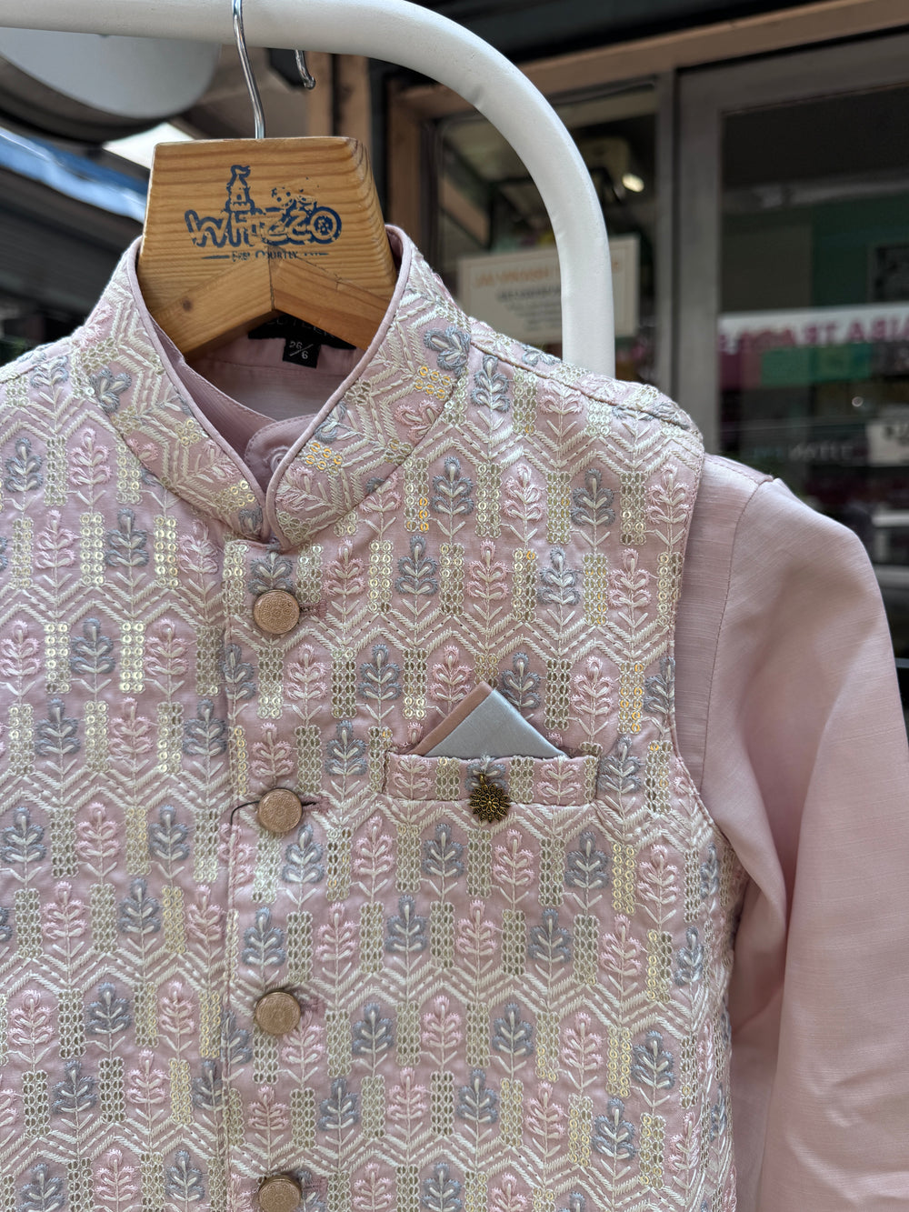 Delicate, elegant, and beautifully refined — this blush pink kurta set paired with a textured pastel Nehru jacket is the perfect pick for daytime festivities and weddings. The soft tones highlight a charming, princely look while keeping your boy stylishly comfortable.