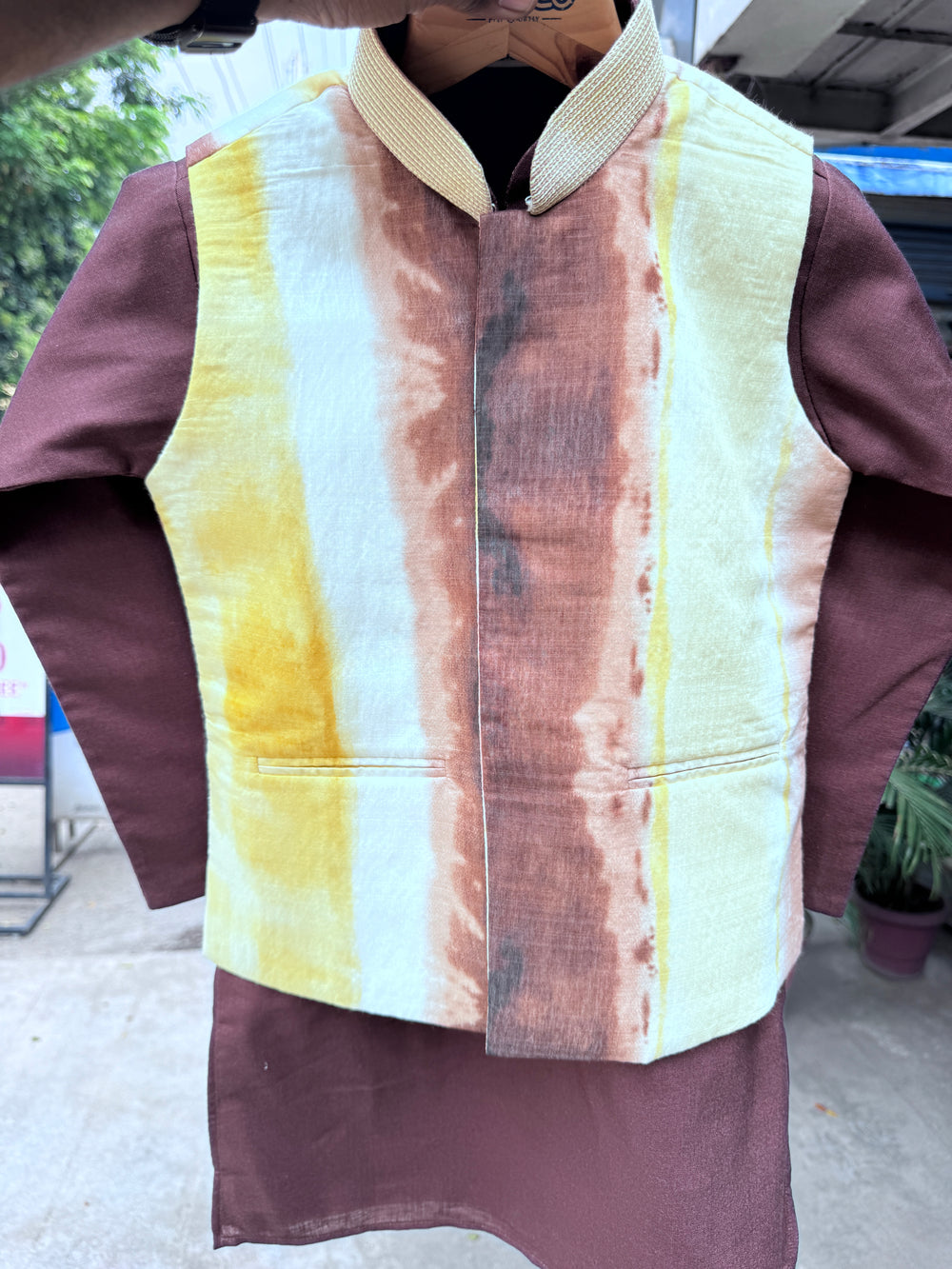 Modern and earthy, this brown kurta set paired with a beige ombré effect jacket brings a refreshing twist to classic ethnic fashion. The jacket features soft transitions of gold and beige with a sheen finish, perfectly complementing the deep chocolate brown kurta underneath.