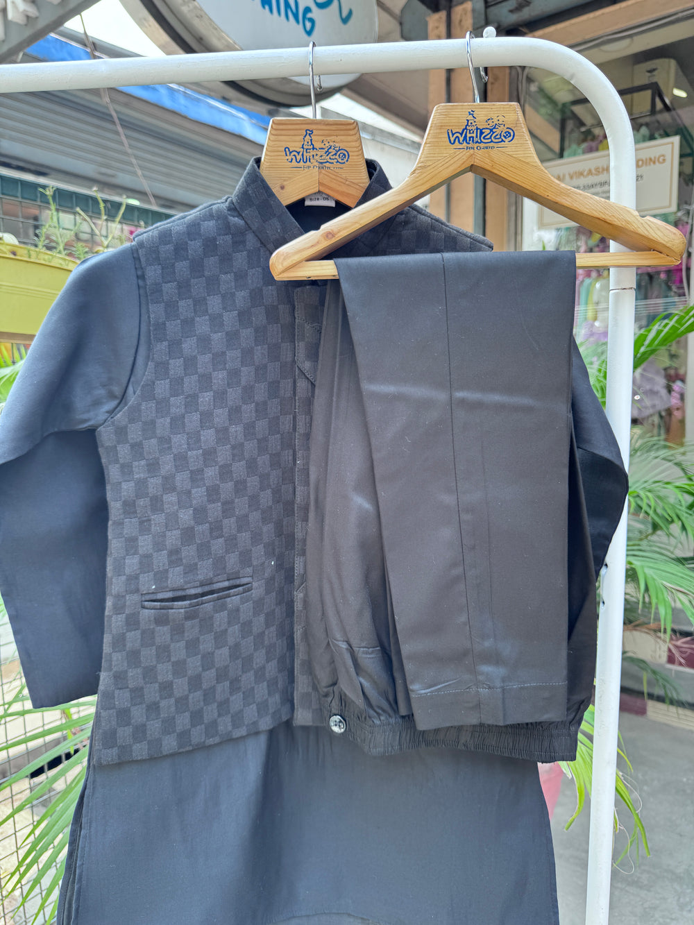 Sophisticated, sleek, and timeless — this black kurta set with a textured Nehru jacket is a must-have for every young gentleman’s festive wardrobe. Crafted from premium fabric, the outfit includes a solid black kurta and churidar, paired with a check-textured sleeveless jacket featuring a mandarin collar and button-down front.