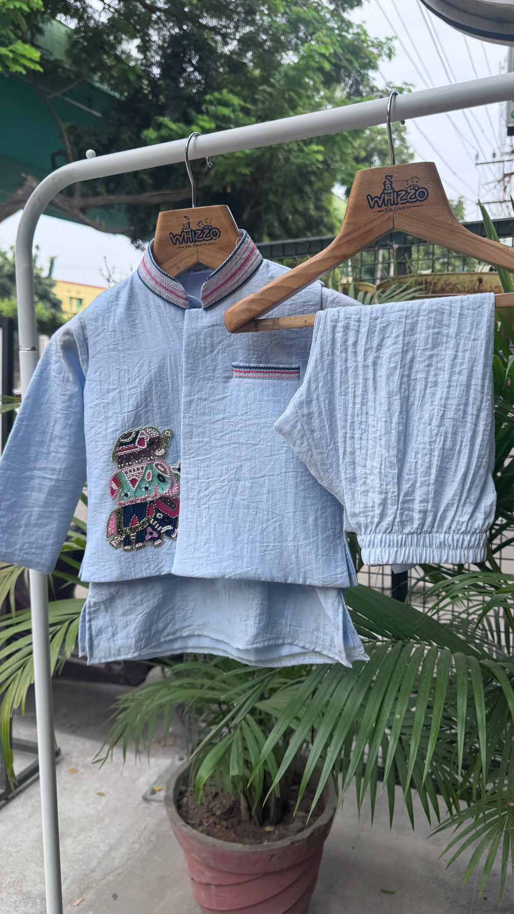 Dress your little champ in effortless charm with this light blue embroidered kurta set, designed to bring together comfort, style, and tradition. The kurta features a smart mandarin collar with striped detailing and a fun, colorful embroidered motif on the side — giving it a unique, playful twist while maintaining its ethnic appeal.