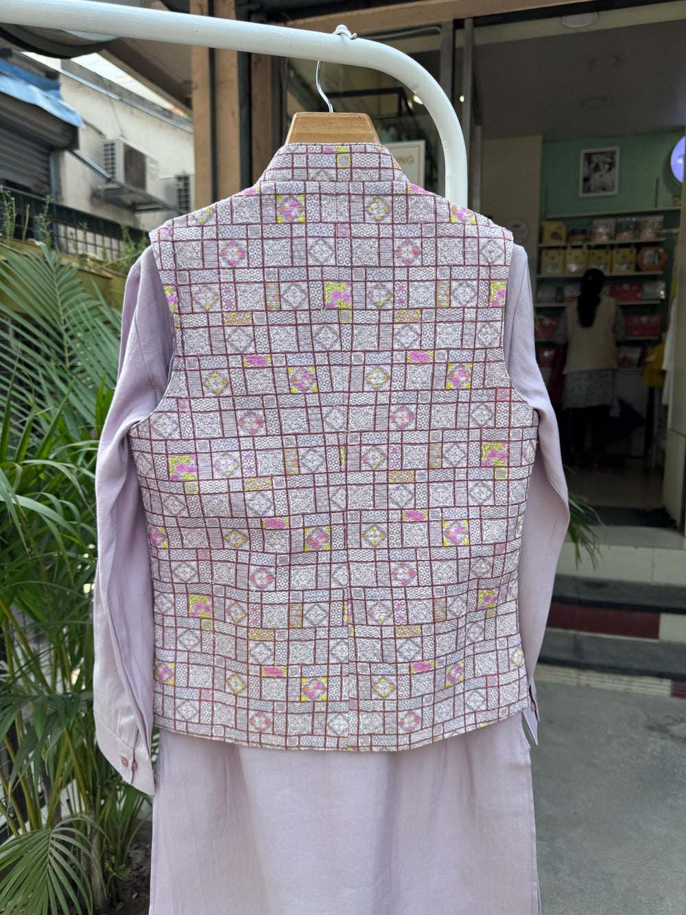 Elegant, refined, and picture-perfect — this lilac kurta set with a grid-patterned brocade jacket brings timeless sophistication to your boy’s festive wardrobe. The subtle pastel tone gives a soft, royal charm, while the intricate threadwork in gold and pink adds luxury without being overpowering.