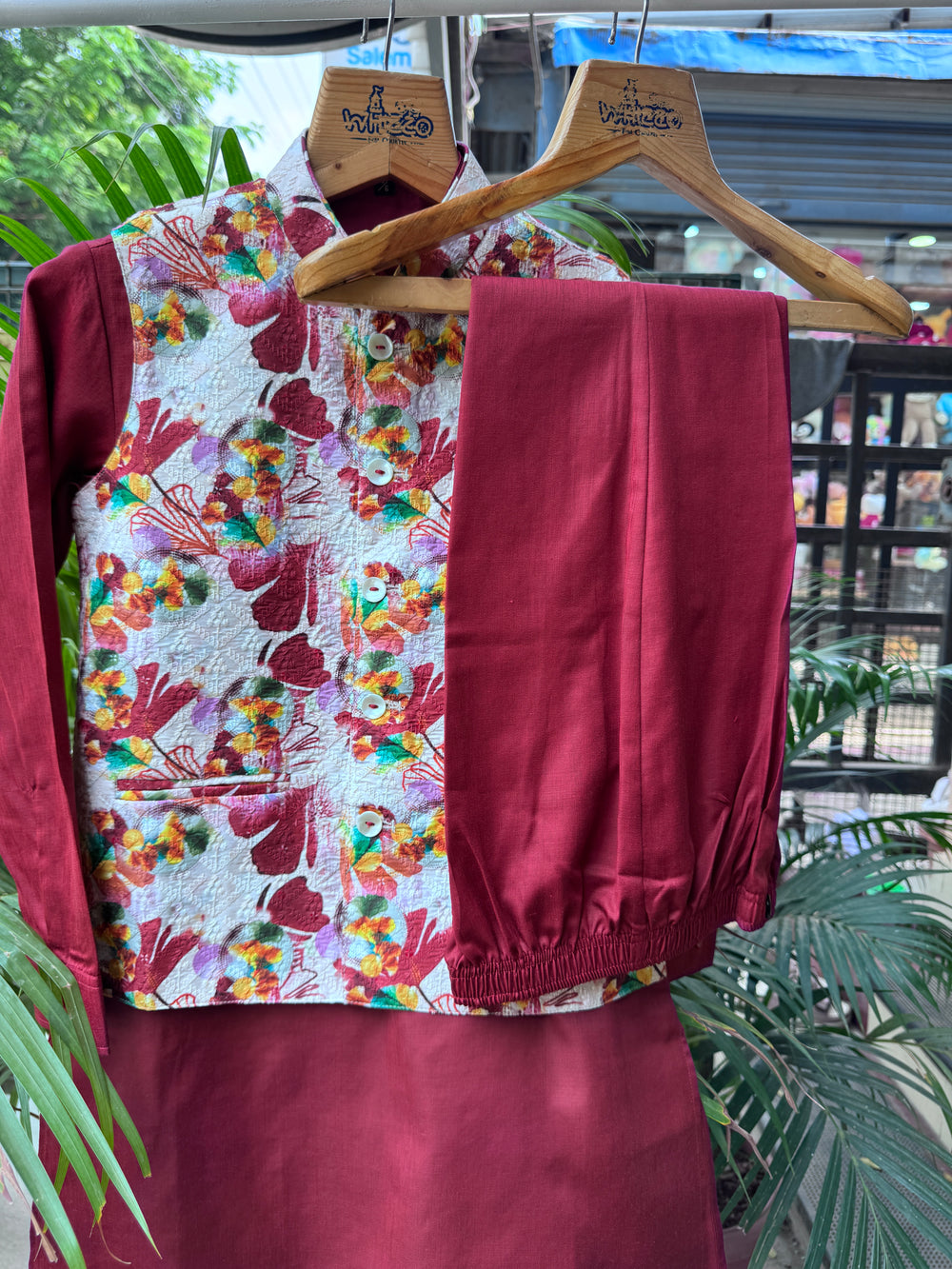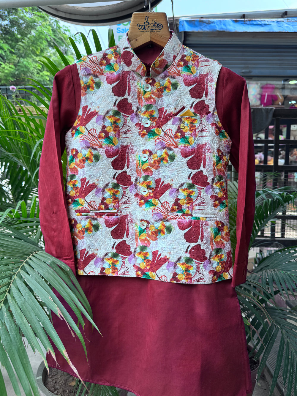 Make every celebration brighter with this maroon kurta set, paired with a white Nehru jacket adorned in colorful floral embroidery. This outfit captures the perfect festive spirit with its vibrant, cheerful design. The soft maroon fabric complements the floral motifs, adding a pop of charm and sophistication.
