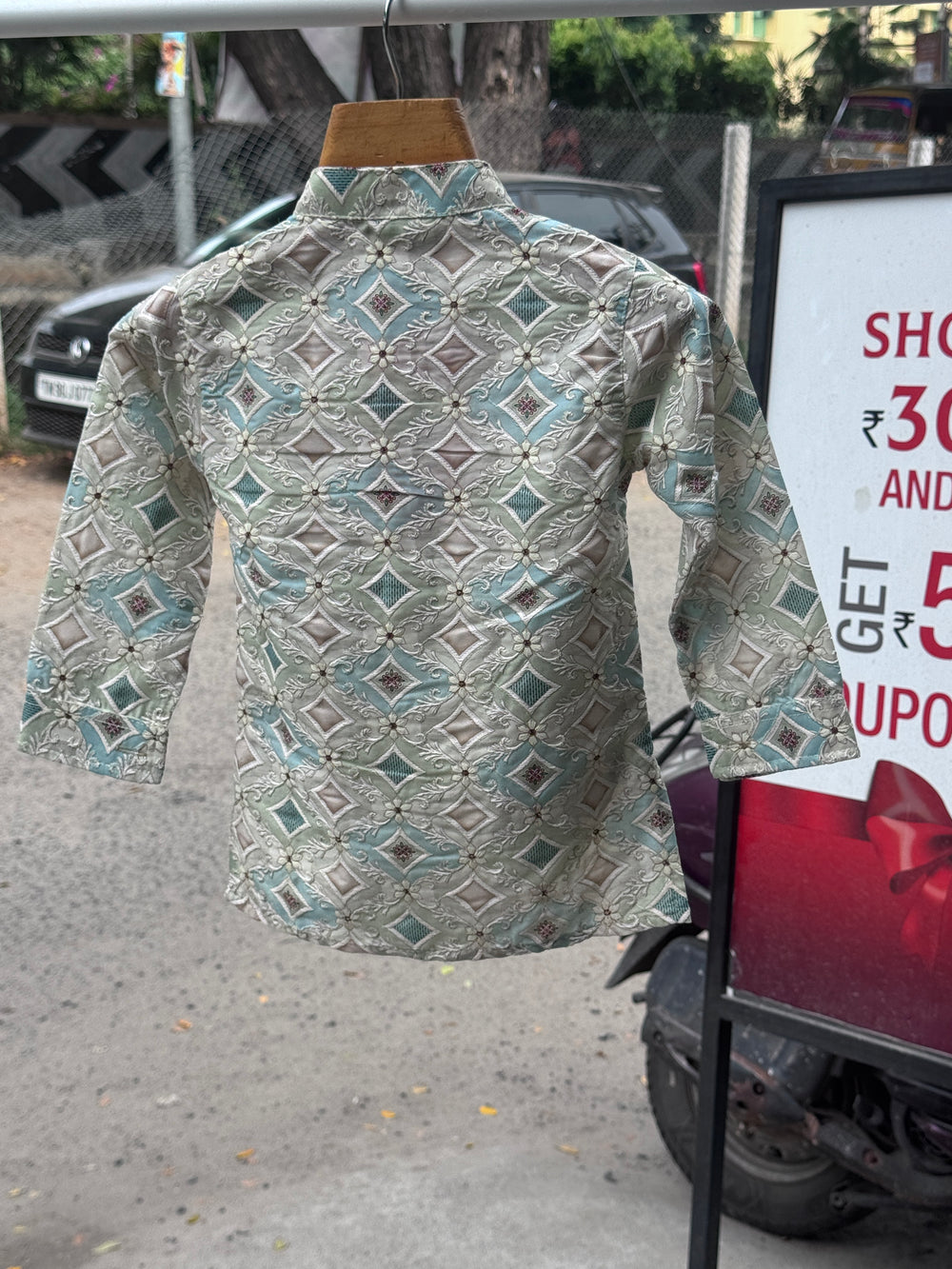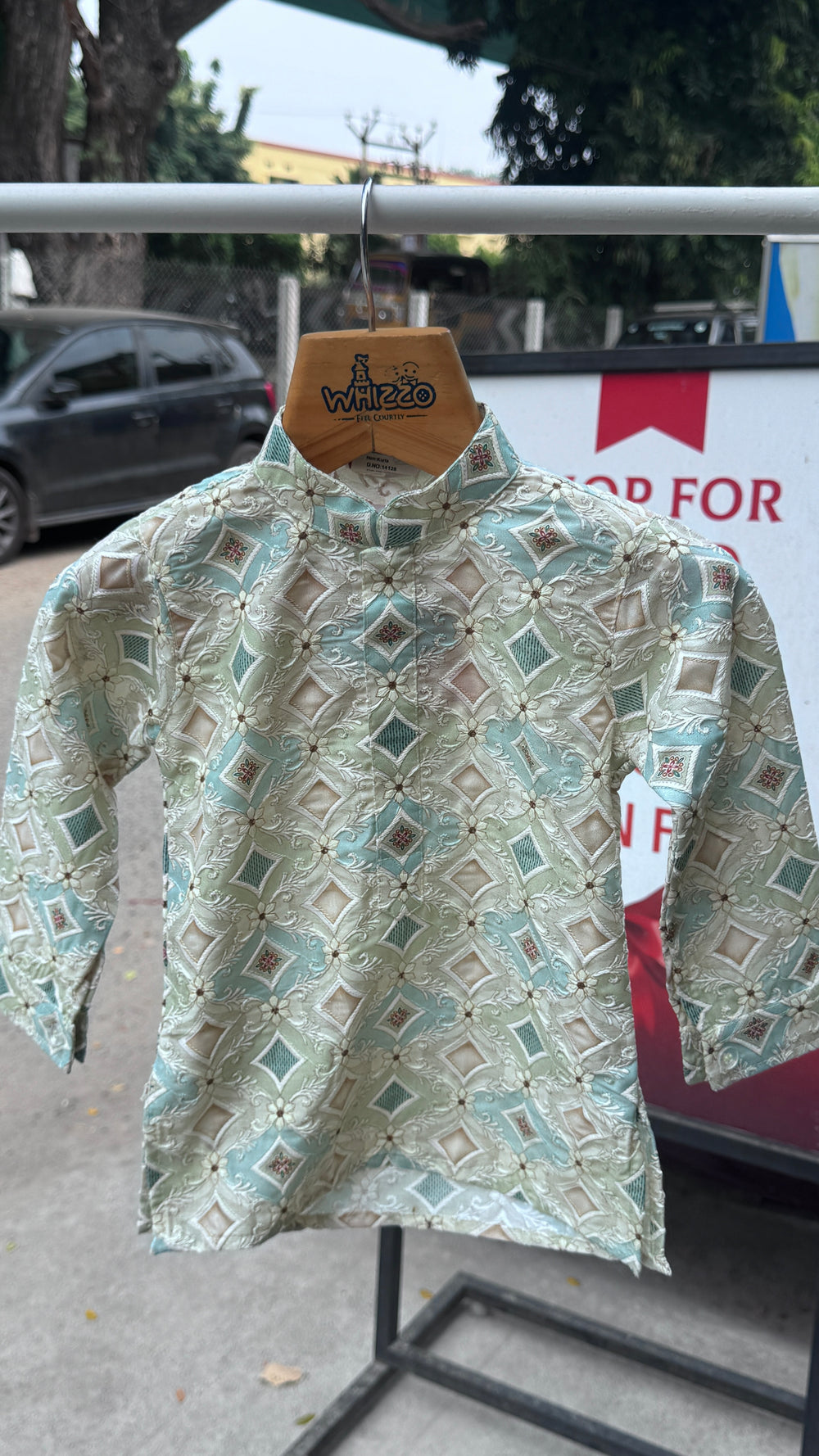 Dress your little one in festive elegance with this beautiful Mint Diamond-Pattern Embroidered Kurta Set, thoughtfully designed for boys aged 1 to 7 years. The kurta features intricate woven diamond motifs in soft shades of mint, ivory, and pastel gold, giving the outfit a rich handcrafted look without being heavy.