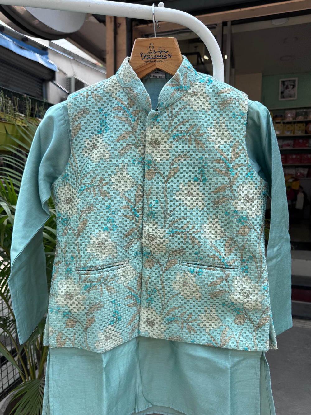 The jacket features intricate woven embroidery, premium metallic buttons, and a matching pocket square for a polished finish. The soft mint kurta and churidar offer a cool, breathable feel — ideal for both outdoor and indoor functions.