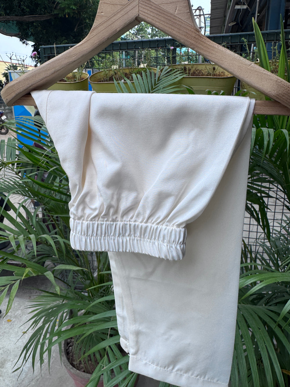 The soft mint fabric is paired with an elegant cream pajama, giving a fresh and regal colour combination suitable for both daytime and evening occasions.