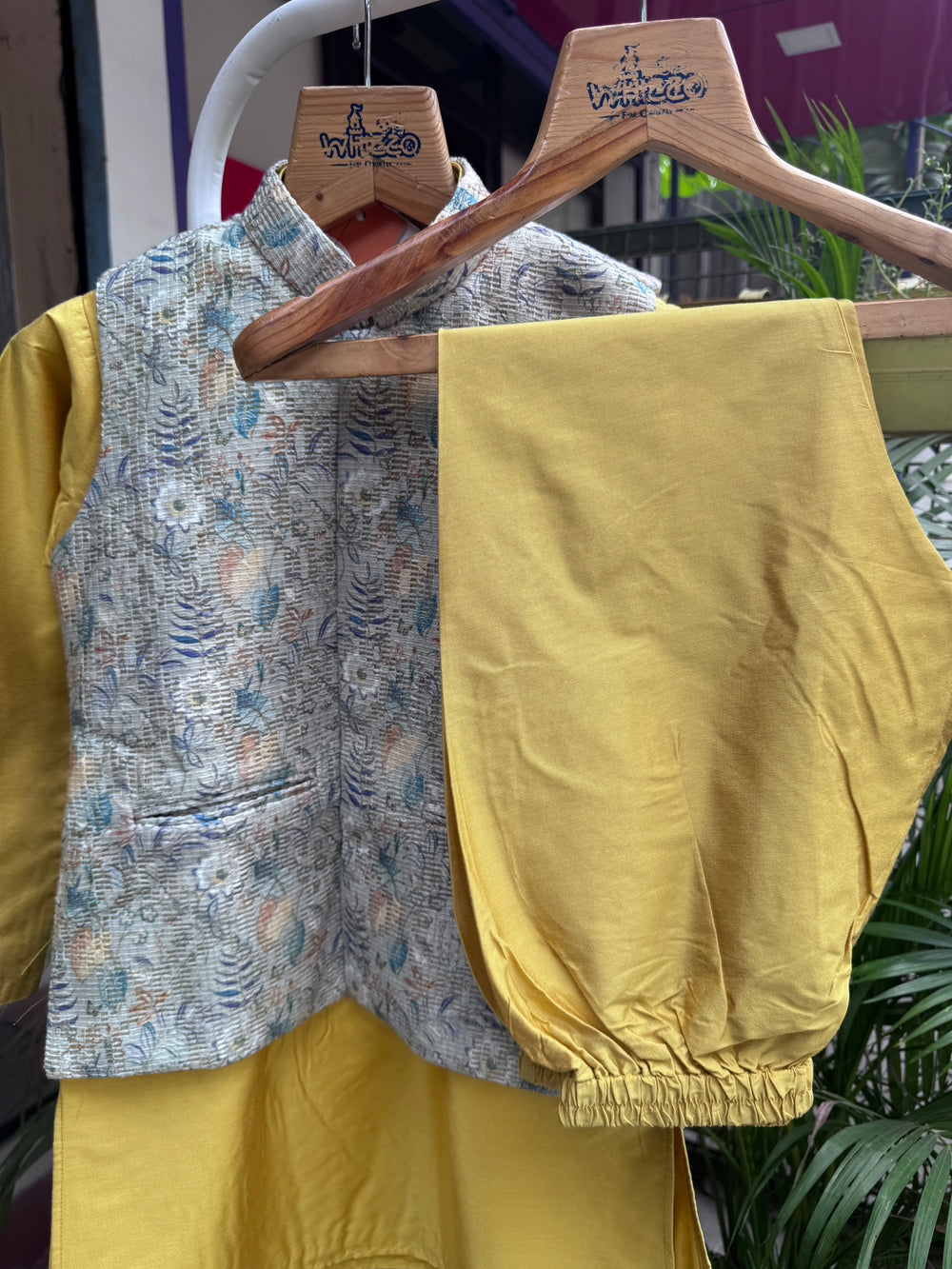 The mustard kurta brings a vibrant festive pop, while the jacket features intricate floral thread embroidery, premium wooden-style buttons, and a matching pocket square to complete the royal look.