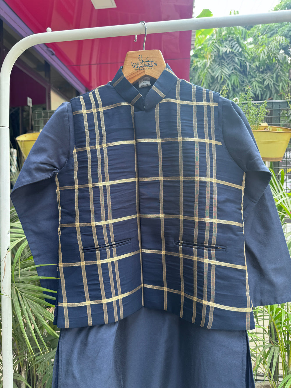 Give your little gentleman a royal festive upgrade with this navy blue kurta set, paired with a striking gold-check patterned Nehru jacket. The kurta and churidar are crafted from soft, breathable fabric for all-day comfort, while the structured sleeveless jacket adds a polished, festive charm.