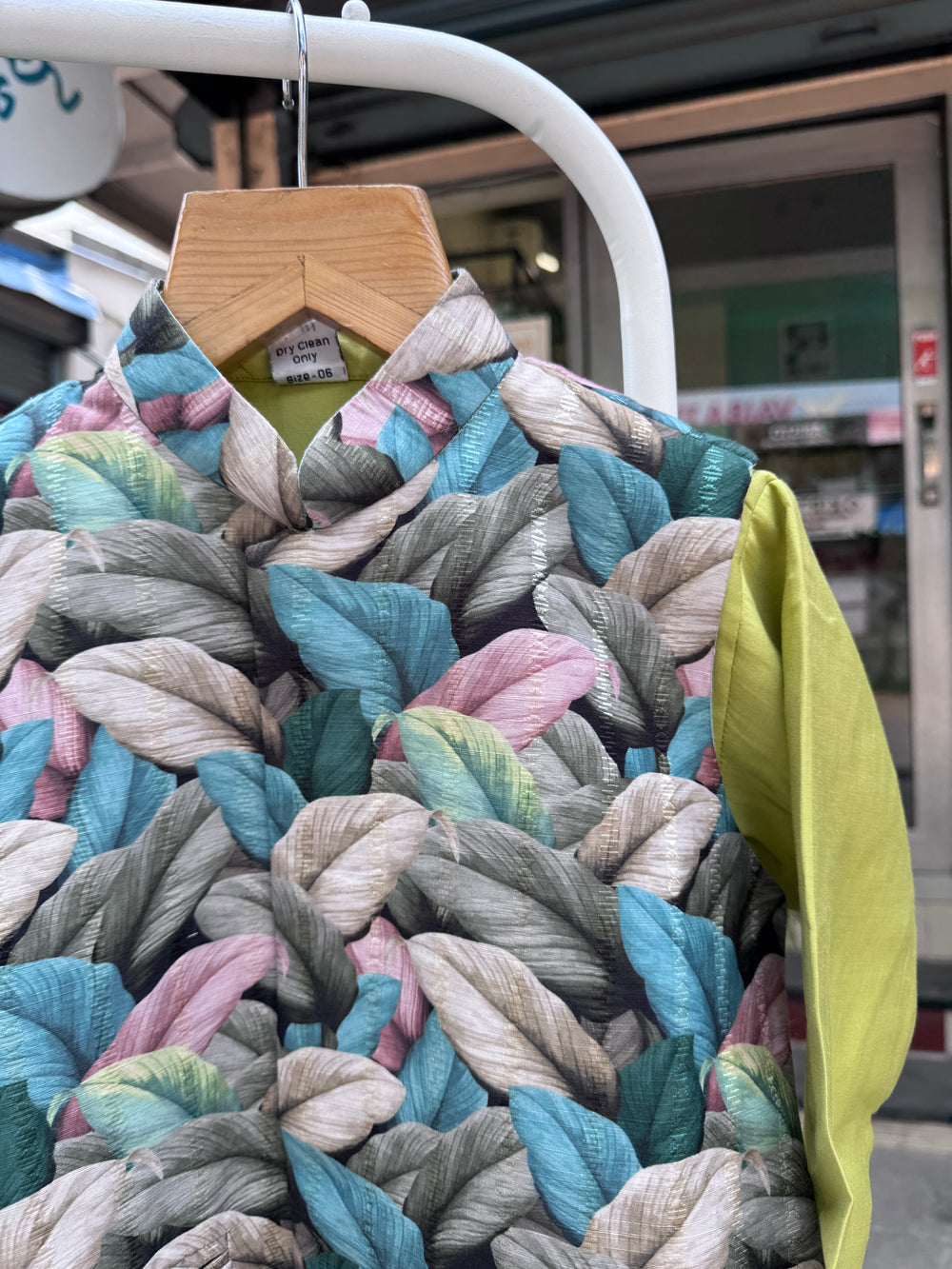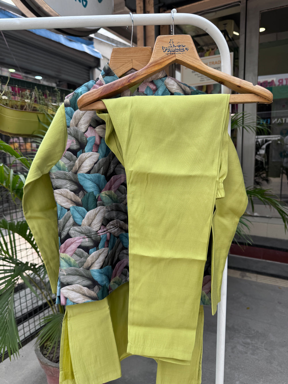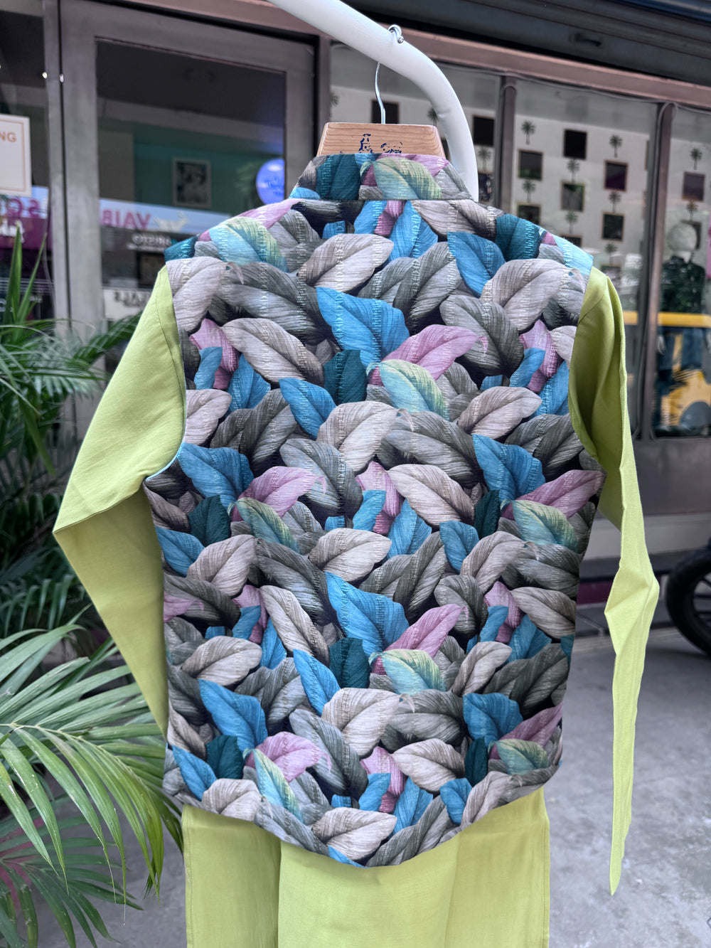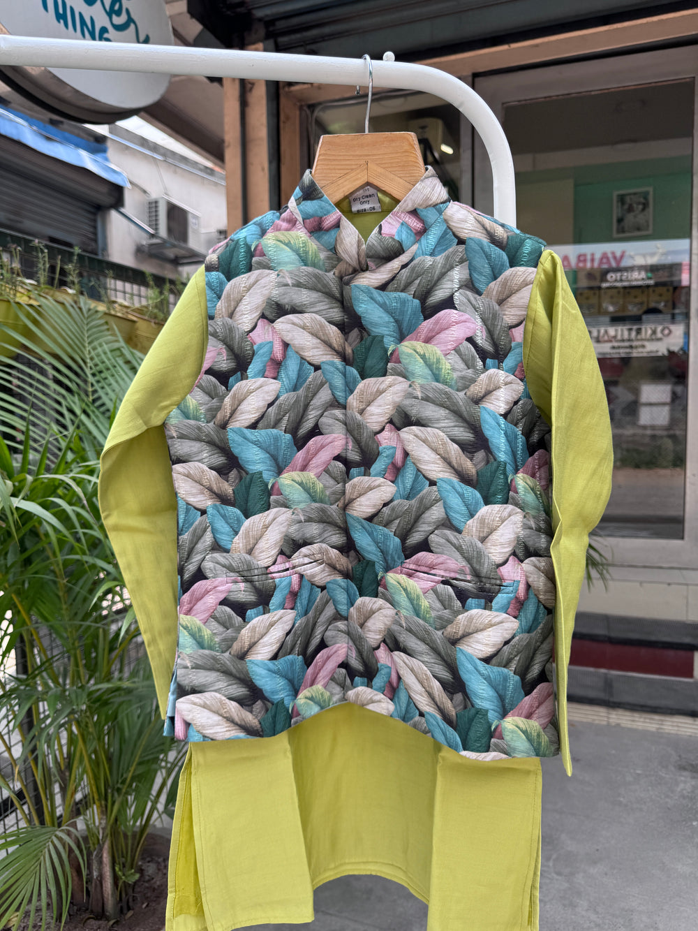 Nature-inspired and bursting with charm, this olive green kurta set with a multi-tone leaf print jacket captures the playful essence of childhood while keeping it stylishly traditional. The mix of soft greens, blues, and neutrals makes it a fun yet elegant festive choice.
