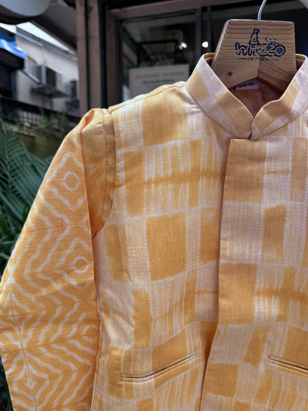 Bright, cheerful, and classy—this Orange Ikat Jacket & Kurta Set brings sunshine to any festive day. Made with soft, breathable fabric and full cotton lining, the set ensures worry-free comfort through all-day celebrations.