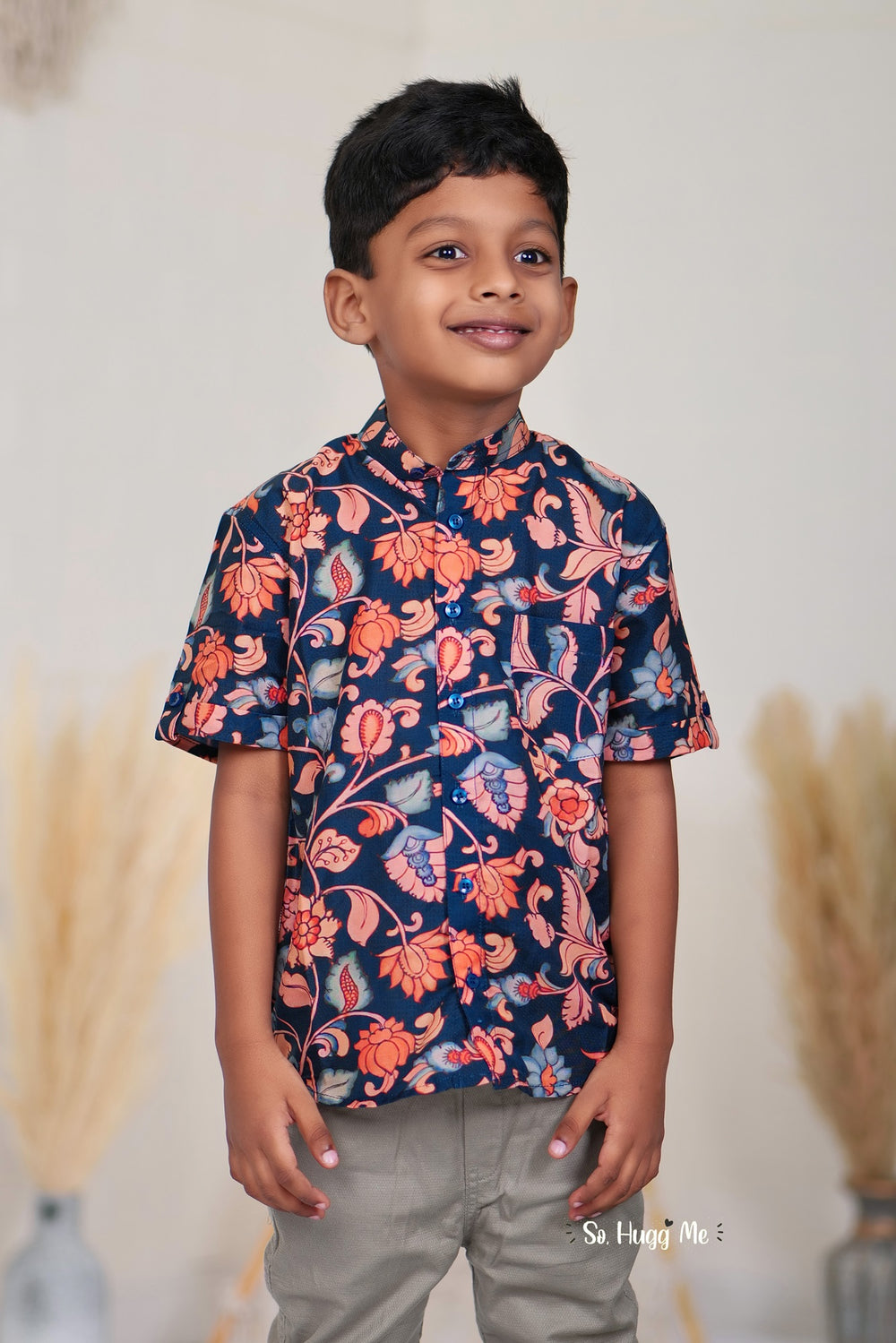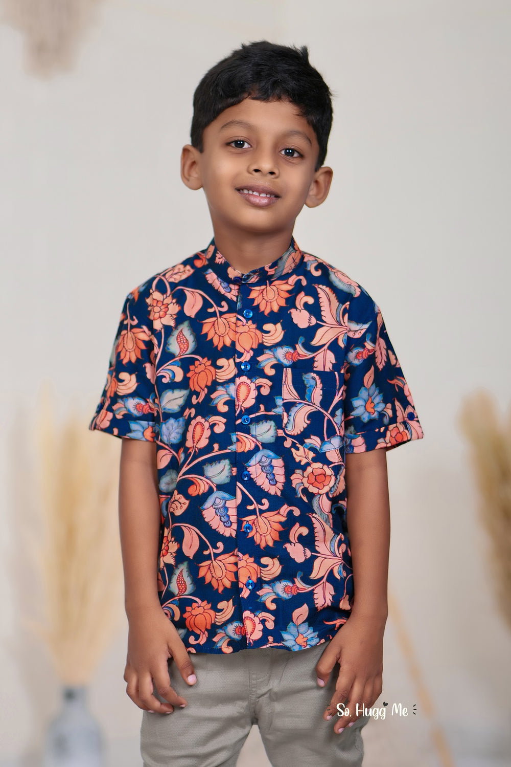 Celebrate summer with this breezy cotton shirt designed for boys who love to play in style. Made from soft Mul Mul cotton, it ensures breathability and comfort all day long. The Ajrakh-inspired detailing adds a touch of cultural beauty, making it suitable for festive occasions and stylish everyday wear.