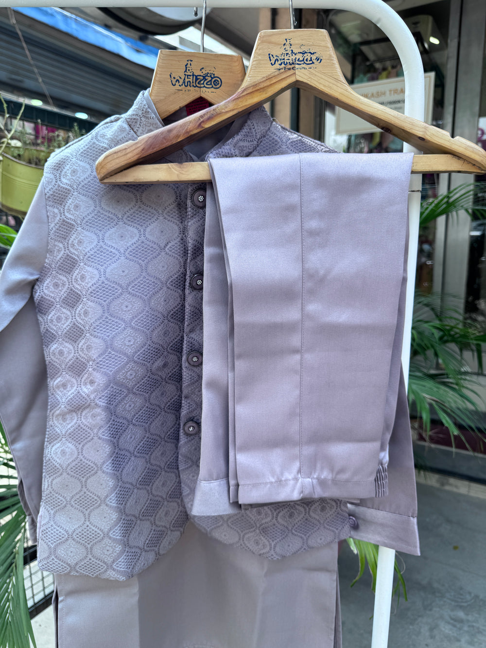 The jacket features delicate silver thread embroidery, premium metallic buttons, and a matching pocket square that elevates the entire look instantly. The kurta and pajama are crafted from soft, breathable fabric—perfect for long hours of celebration.