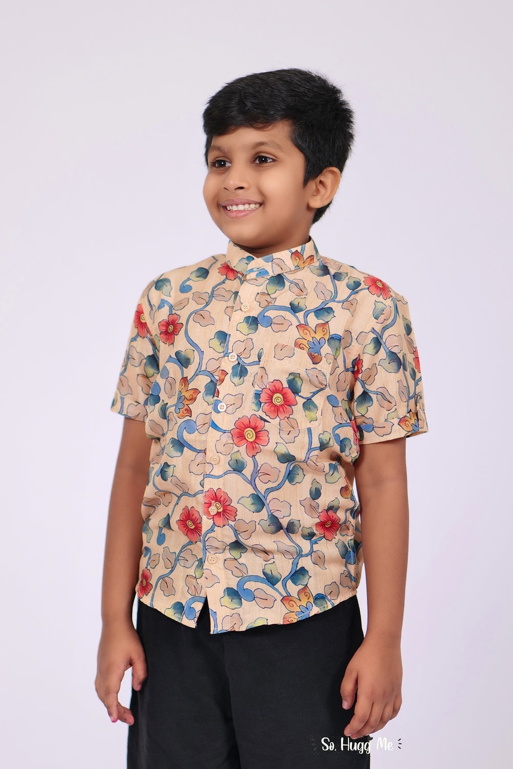 Designed for style-conscious kids, this printed shirt offers lightweight comfort and bold charm. Made from soft Mul Mul cotton, it ensures breathability and comfort all day long. The Ajrakh-inspired detailing adds a touch of cultural beauty, making it suitable for festive occasions and stylish everyday wear.