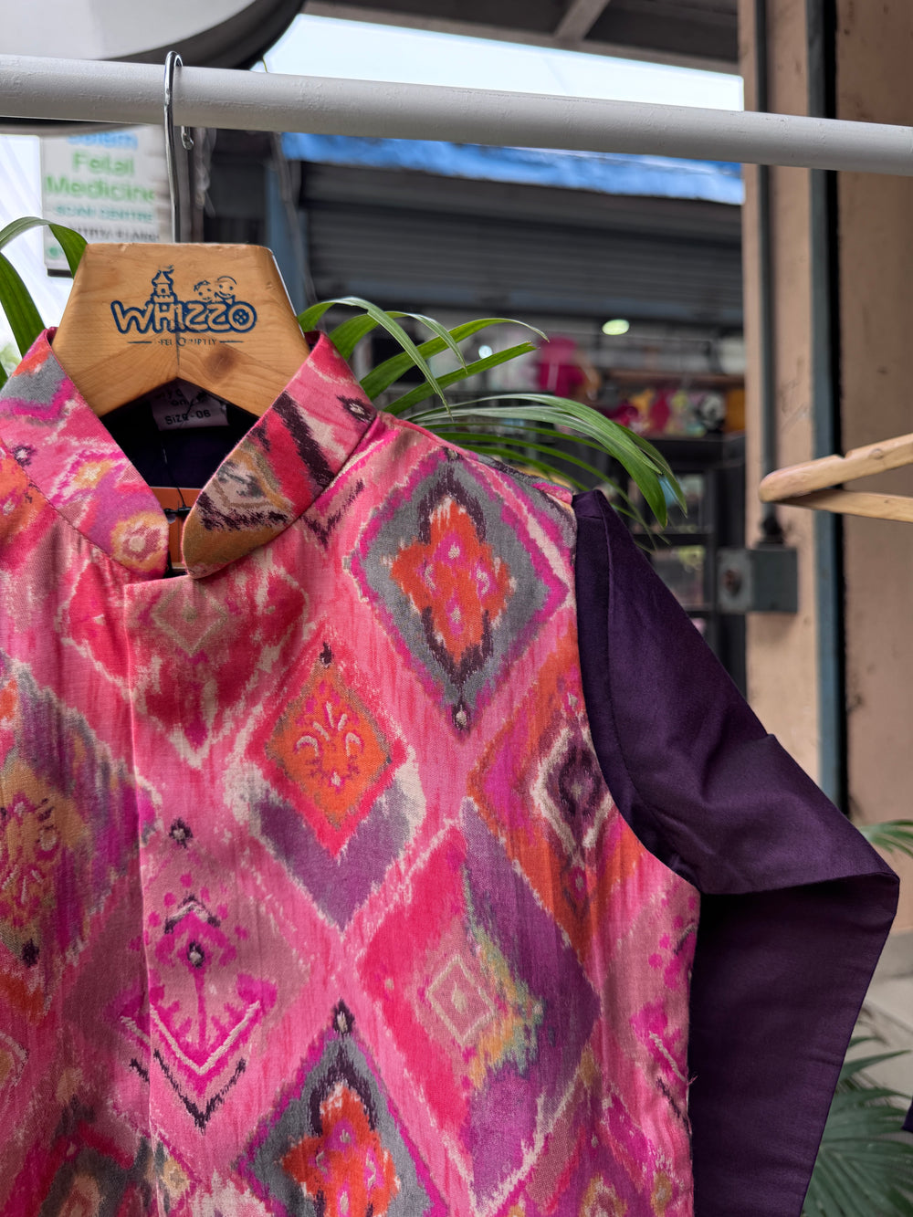 Bold, colorful, and full of fun — this purple kurta set with a vibrant Ikat printed Nehru jacket is made for little stars who love to shine bright. The geometric pattern in shades of pink, orange, and magenta adds a pop of excitement, while the deep purple base keeps it classy and grounded.