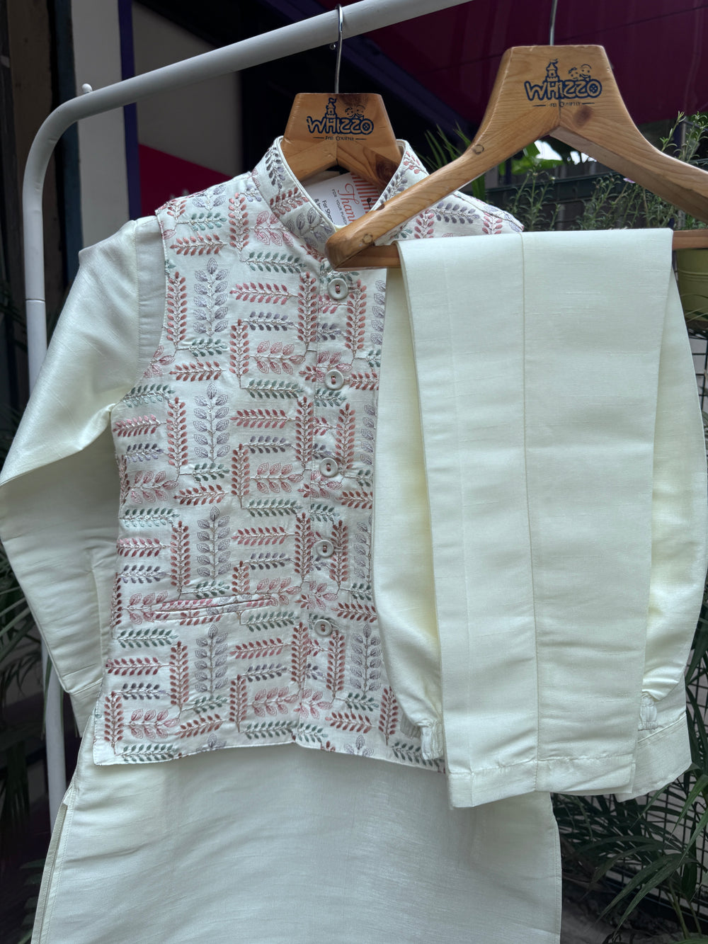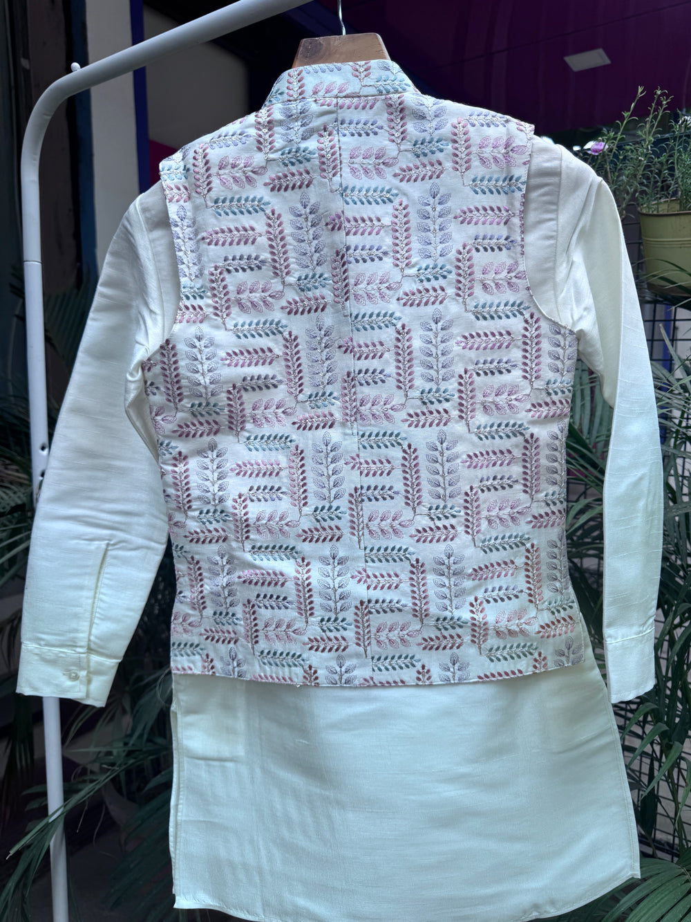 ntroduce your child to a world of subtle elegance with our Cream Leaf-Embroidered Jacket Kurta Set, a perfect blend of tradition, comfort, and premium craftsmanship.