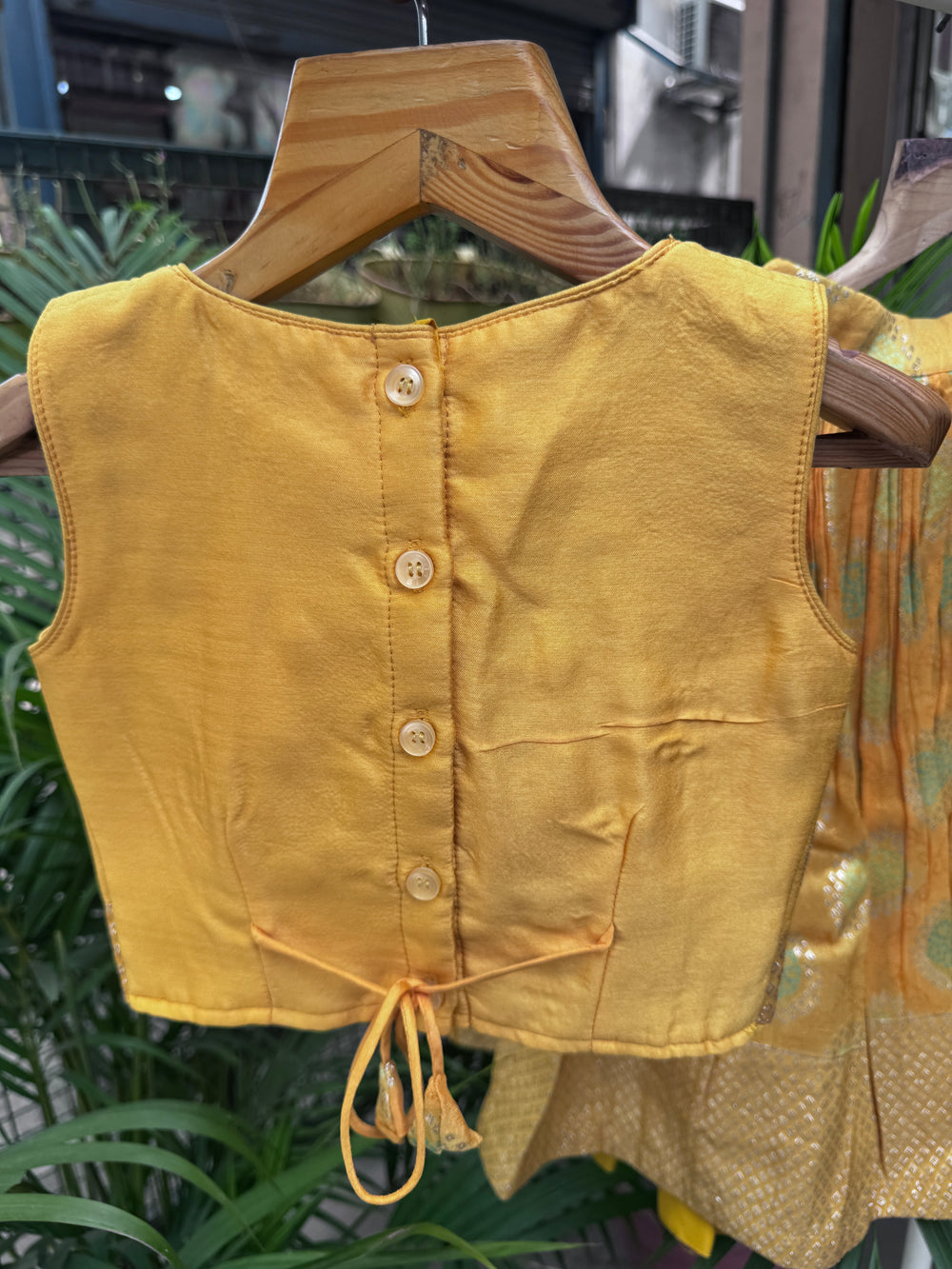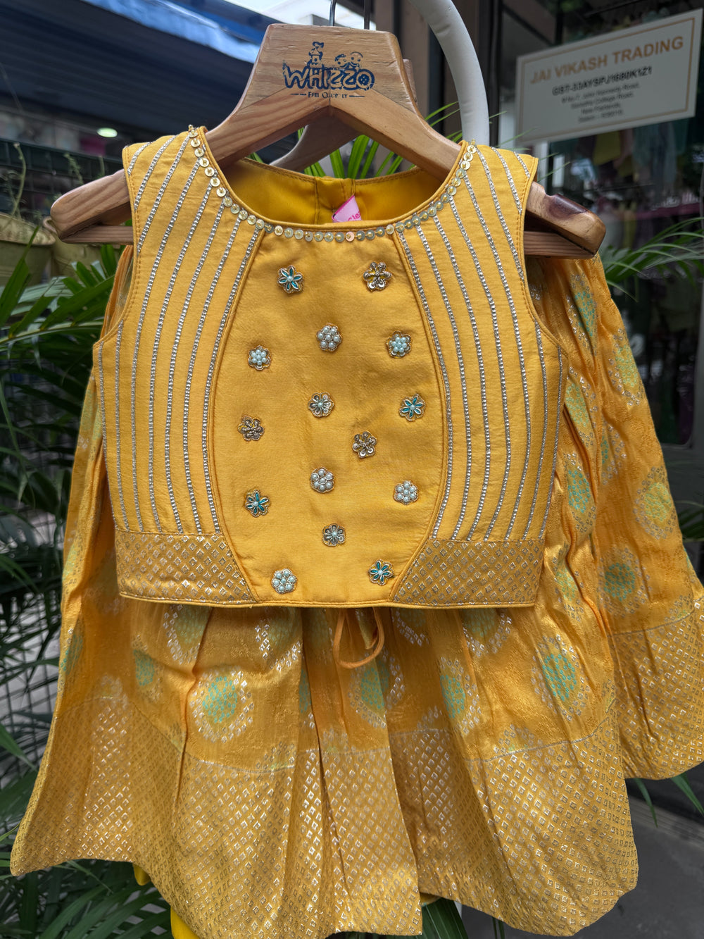 Bright, joyful and festive — this Sunshine Yellow Lehenga Choli Set is designed to make your little girl glow at every celebration. The sleeveless choli features elegant hand-embroidered mirror work and floral embellishments, adding a premium sparkle that perfectly complements the festive season.