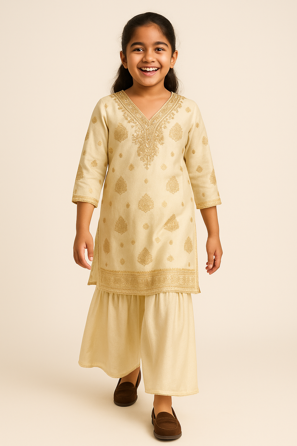Let her shine in timeless elegance with this cream and gold embroidered kurta with palazzo set, crafted to make festive dressing graceful and comfortable. The kurta features intricate zari embroidery with sequins and bead detailing along the neckline and borders, paired with subtle golden motifs across the fabric. Designed in a rich, traditional style, the outfit balances sophistication with ease of movement – perfect for little fashionistas.