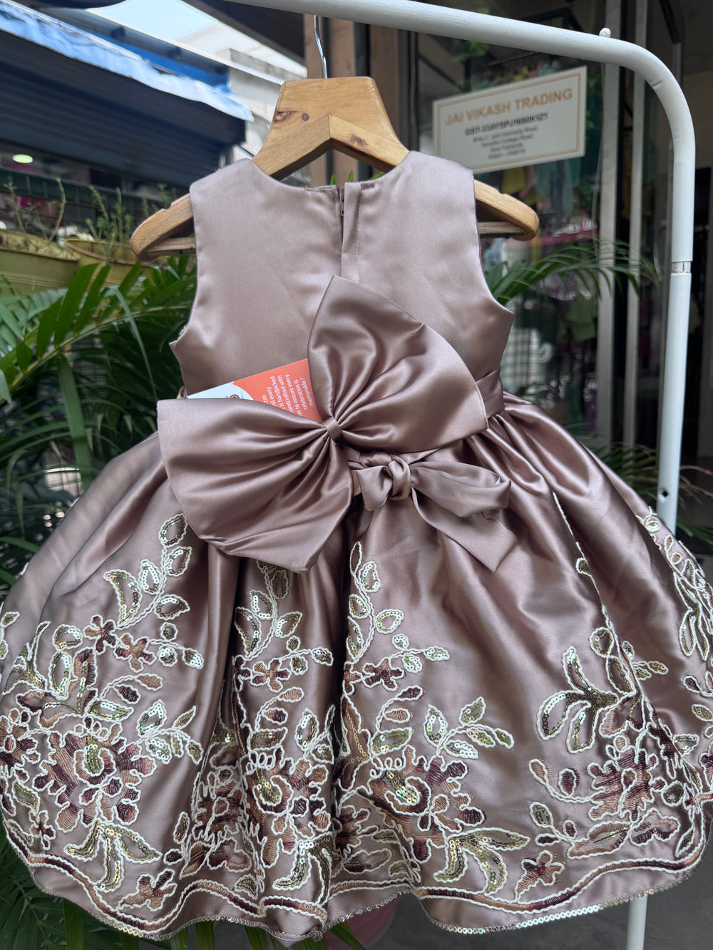 A royal-style golden party frock crafted for your little one to shine at every celebration. The dress features a luxurious satin finish with intricate floral embroidery along the bodice and hemline, giving it a rich and elegant look.