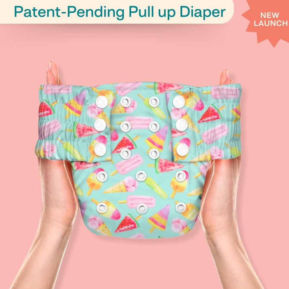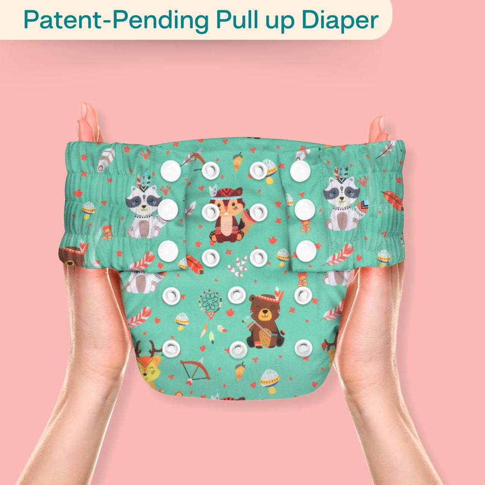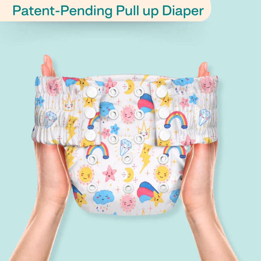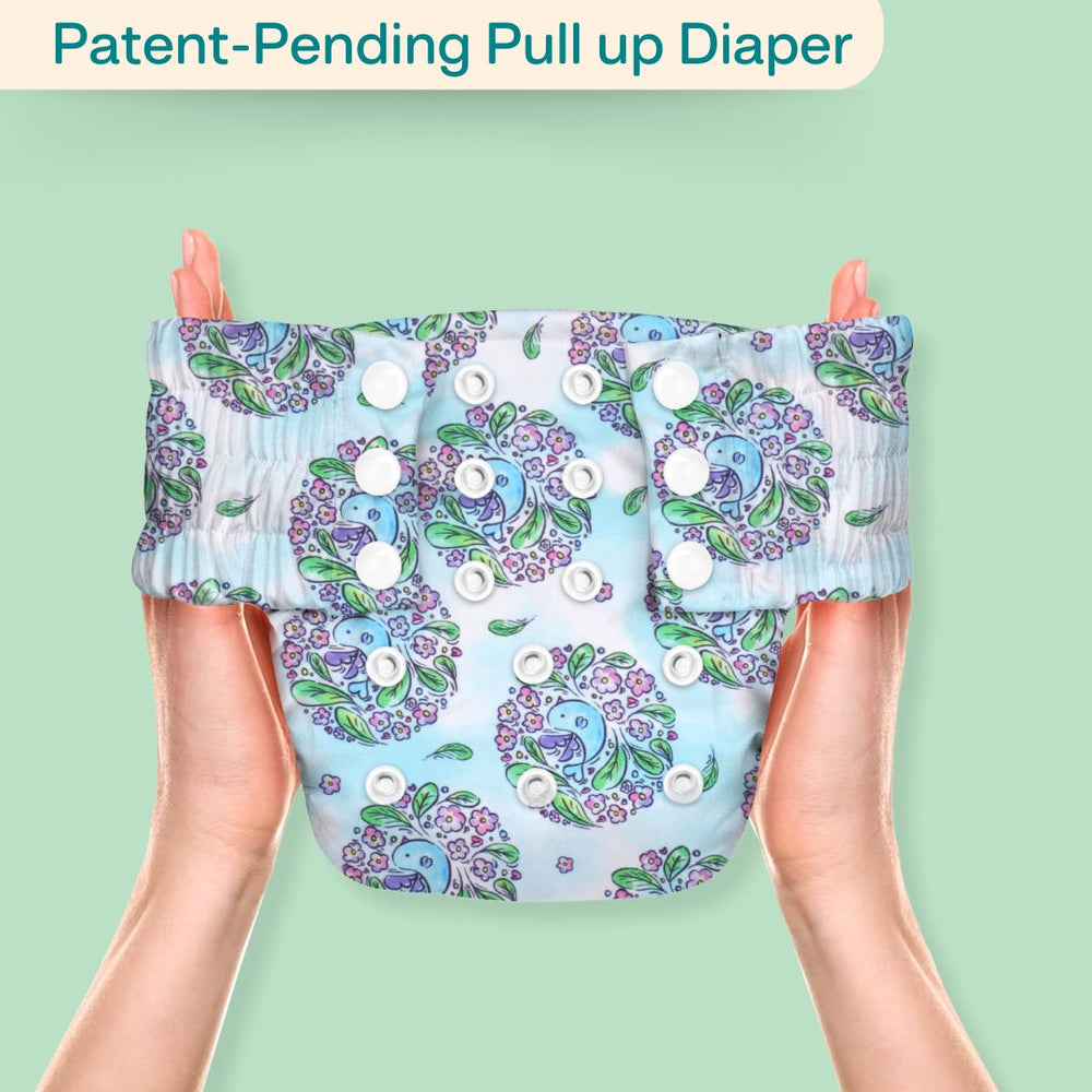 Our patent-pending design combines the ease of a pull-up diaper with the adjustability of snap buttons. It offers a perfect fit, superior absorbency, and unmatched convenience for parents looking for a modern cloth diapering solution.