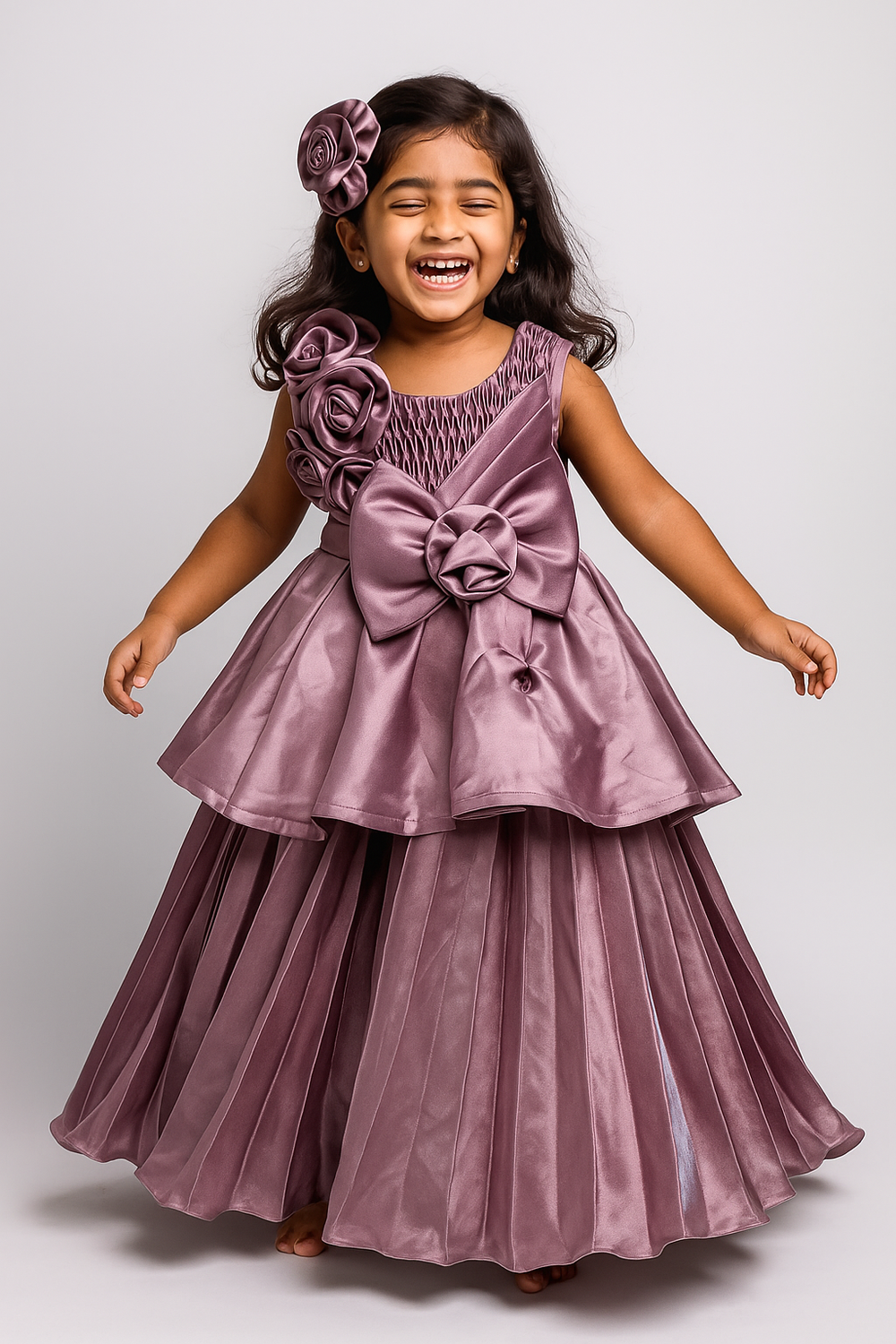 Let your princess make a grand style statement with this lavender full-length layered gown, designed for girls aged 3 to 10 years. Crafted with an elegant pleated skirt, oversized bow at the waist, and striking 3D floral embellishments on the shoulder, this gown is a true designer piece perfect for birthdays, weddings, parties, and festive occasions.