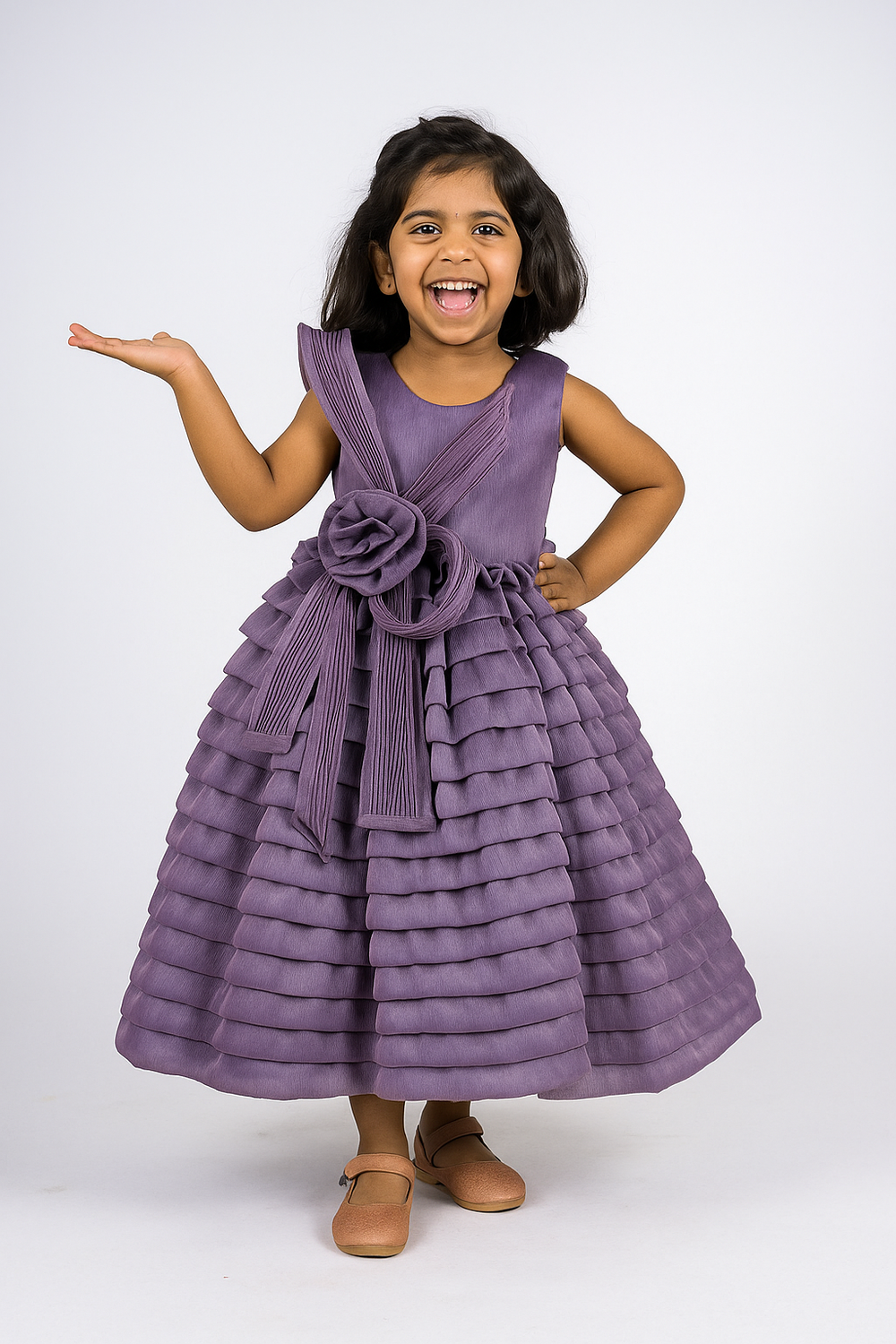 Let your little one shine like a princess in this lavender full-length gown, specially designed for girls aged 3 to 10 years. With its elegant layered ruffles and oversized flower bow, this gown is perfect for birthdays, weddings, school functions, and festive occasions.