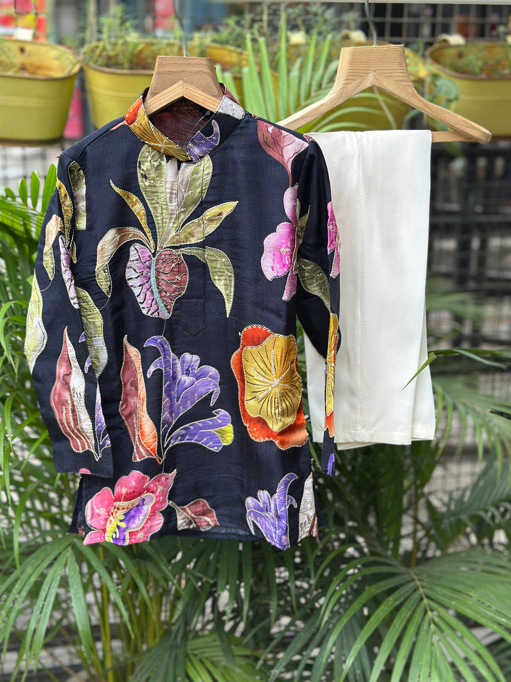 Let your little trendsetter shine in our Midnight Garden Baby & Toddler Boys Kurta Set, crafted for ages 6 months to 4 years. This striking outfit is a modern twist on tradition—designed with bold floral motifs on a deep navy base, paired with crisp white pants for a stylish and comfortable festive look.