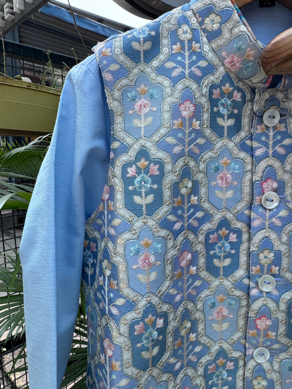 This set features a pastel mosaic-printed Nehru jacket crafted with rich detailing and finished with a stylish pocket square. The soft mint blue kurta and matching churidar complement the jacket beautifully, creating a premium coordinated look perfect for weddings, festivals, and celebrations.