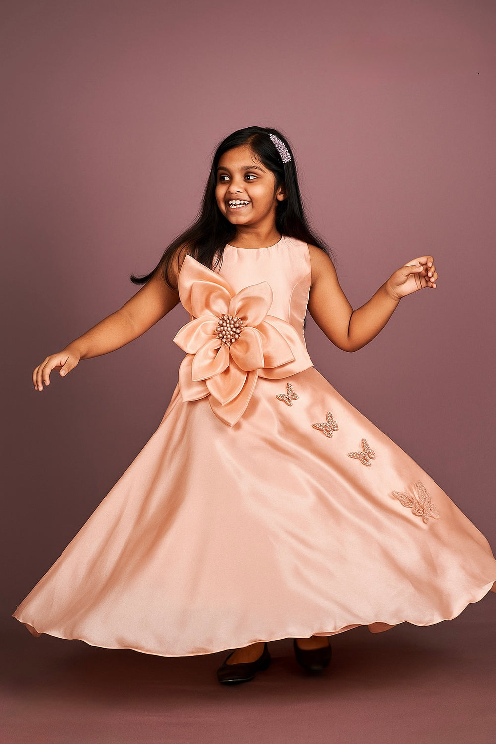 Give your little princess a dreamy makeover with this peach full-length gown, designed for girls aged 3 to 10 years. Featuring an eye-catching oversized flower bow and delicate butterfly embroidery, this gown is the perfect balance of elegance and playfulness. Ideal for birthdays, weddings, festive events, and special occasions.
