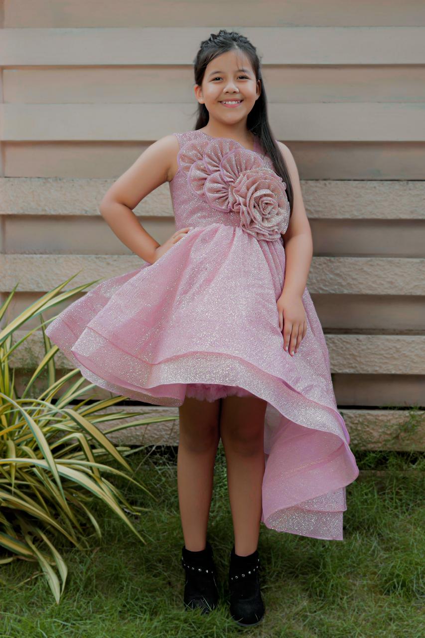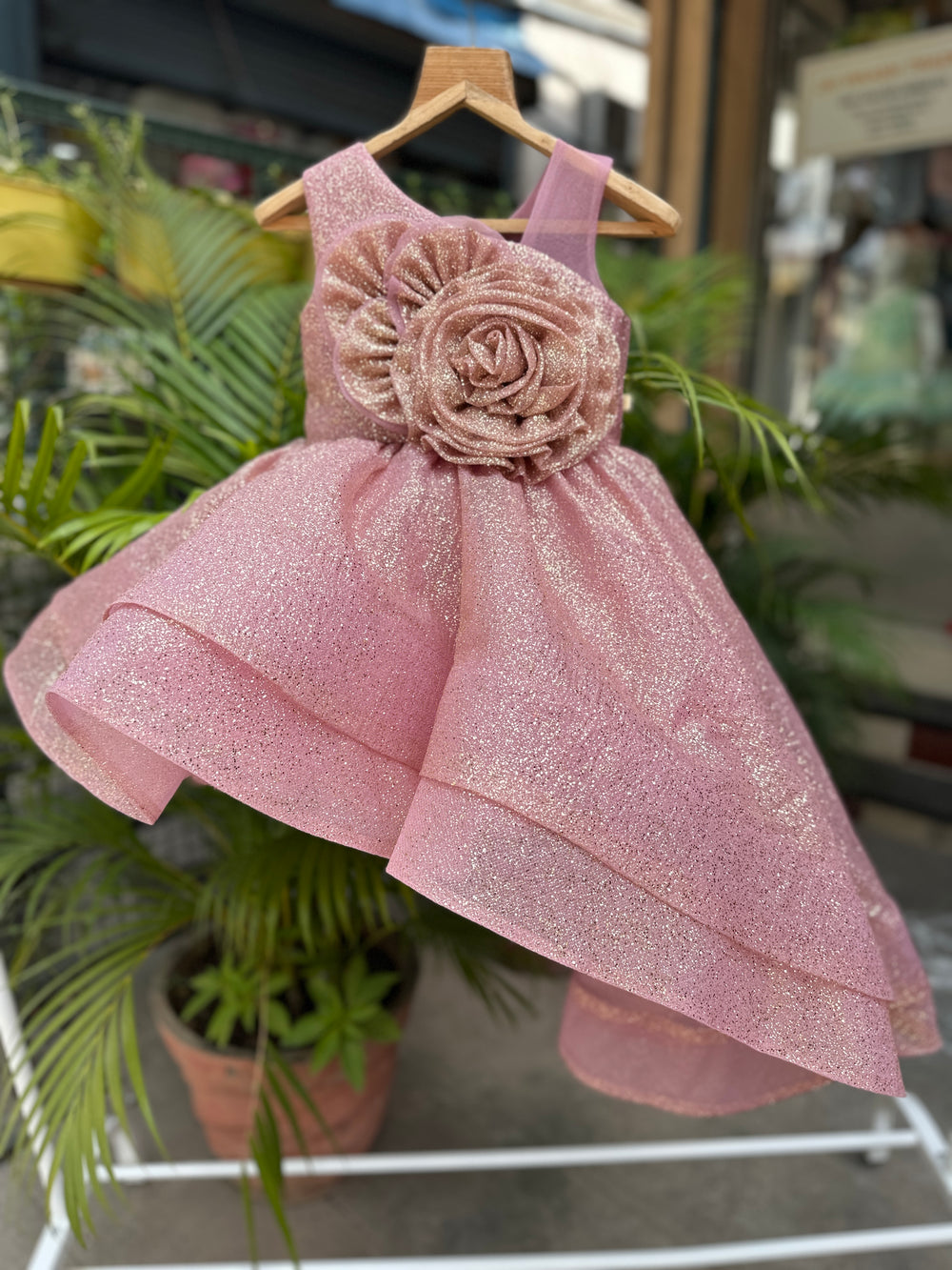 Let your princess sparkle with confidence in this pink glitter high-low gown, specially crafted for girls aged 3 to 10 years. Designed with a dramatic oversized 3D rose appliqué on the bodice and a layered asymmetrical skirt, this gown brings together elegance, glamour, and playful charm—perfect for birthdays, weddings, and festive celebrations.
