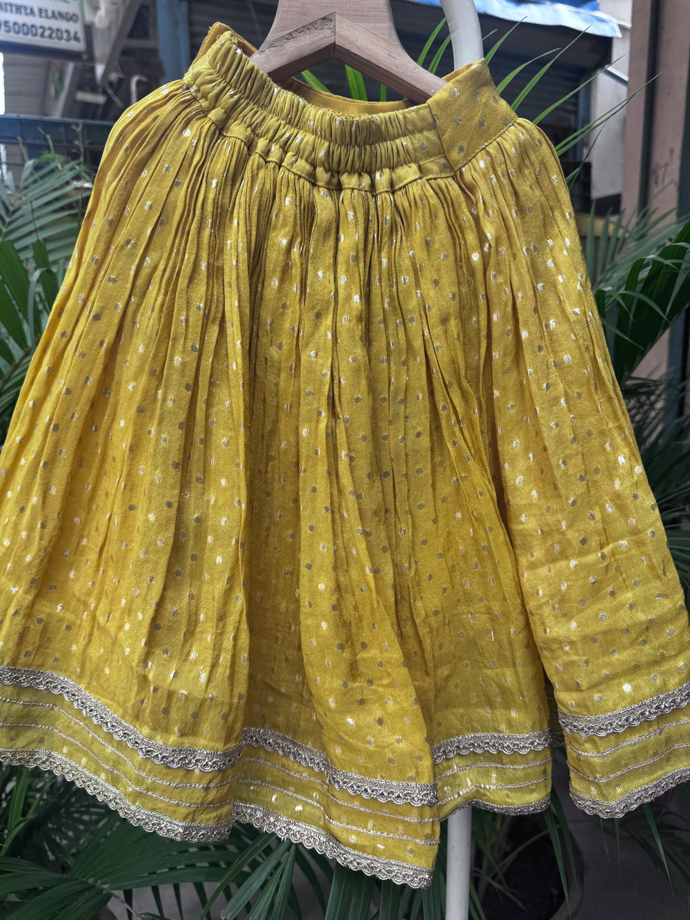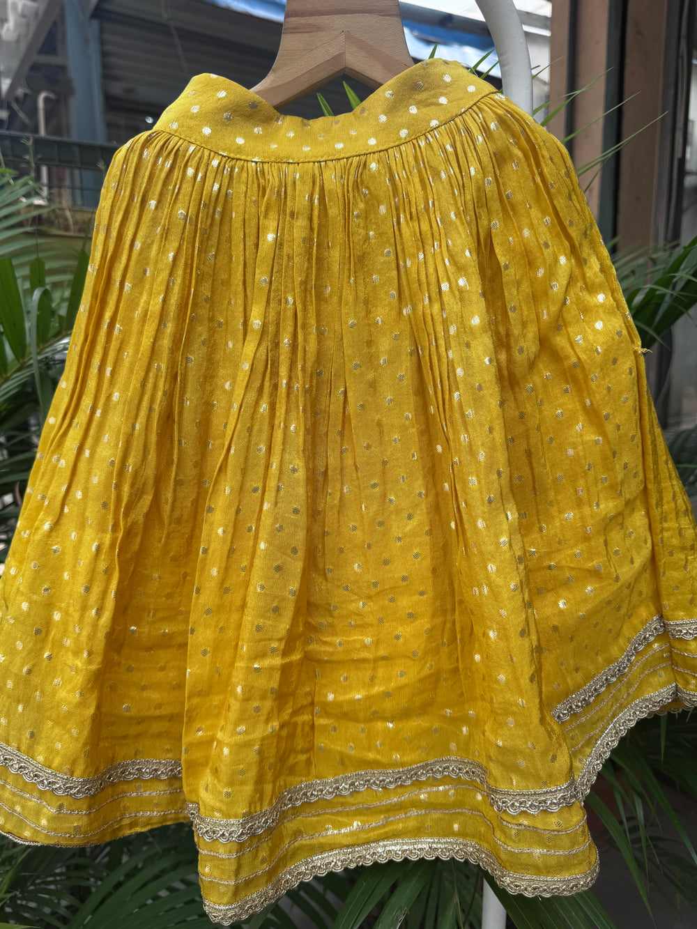The lehenga comes in a rich mustard shade with gold foil and sequin butti detailing, adding a soft shimmer with every twirl. The flare is generous, flowy, and extremely comfortable—crafted to keep your princess looking stylish while feeling relaxed throughout long celebrations.