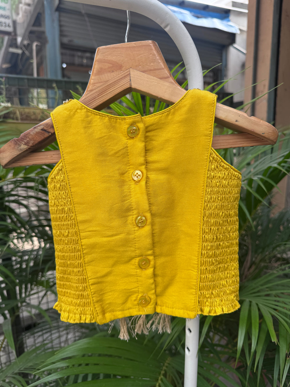 Give your little girl the perfect festive sparkle with this stunning Mustard Yellow Lehenga Set, designed to make her shine at every celebration. The sleeveless blouse features intricate sequin handwork, vertical shimmer lines, and a uniquely curved hemline with delicate tassels for added charm.