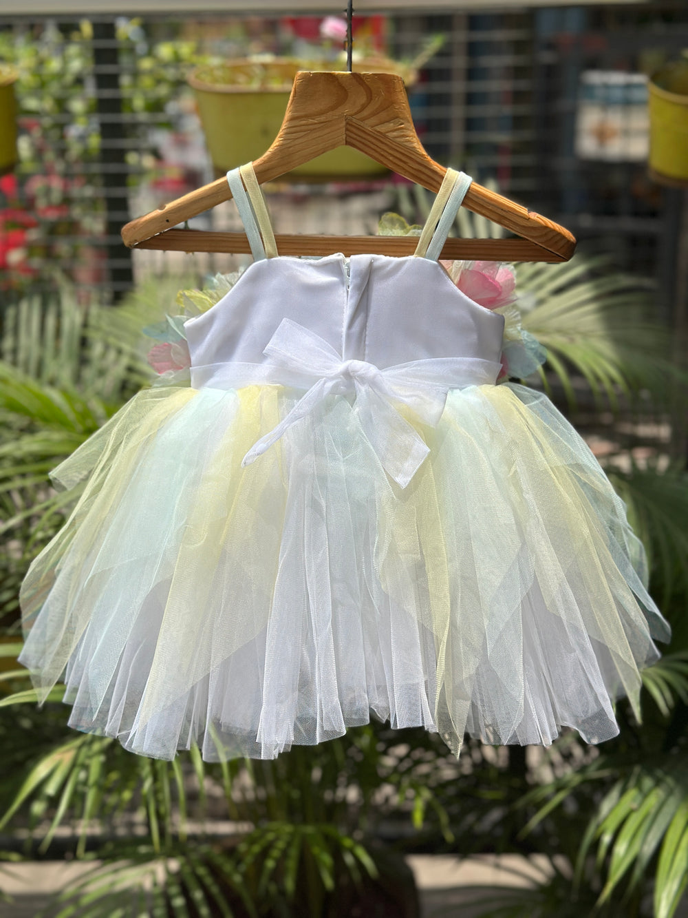 A pastel yellow dress with vibrant 3D petals in rainbow shades – playful, colorful, and crafted for joy. A perfect twirl-worthy piece for sunny days.