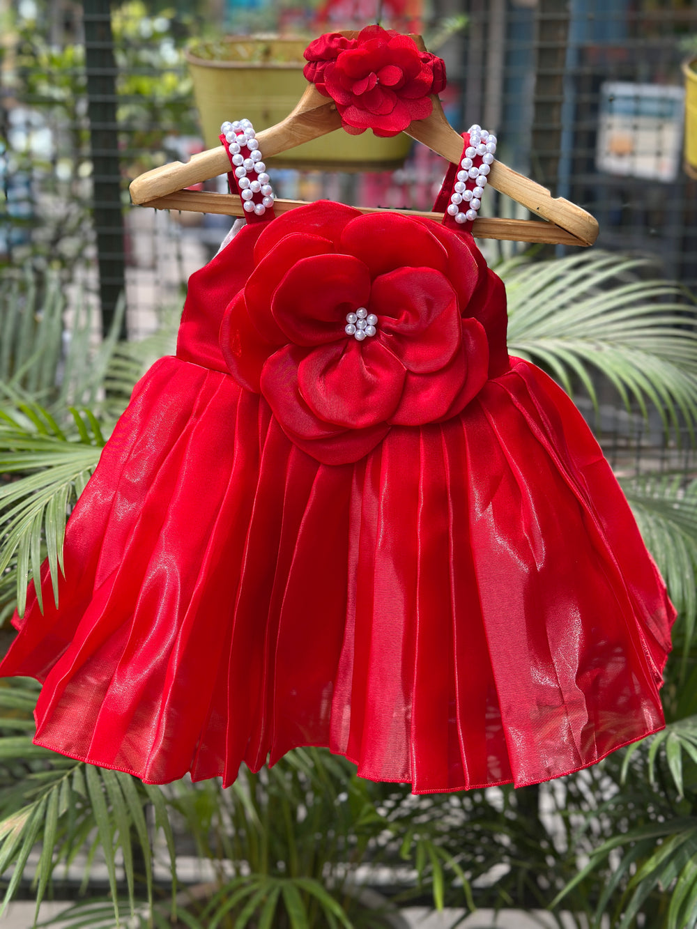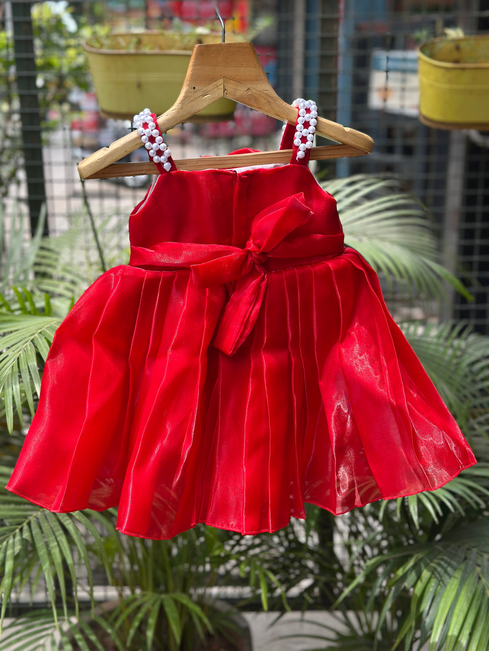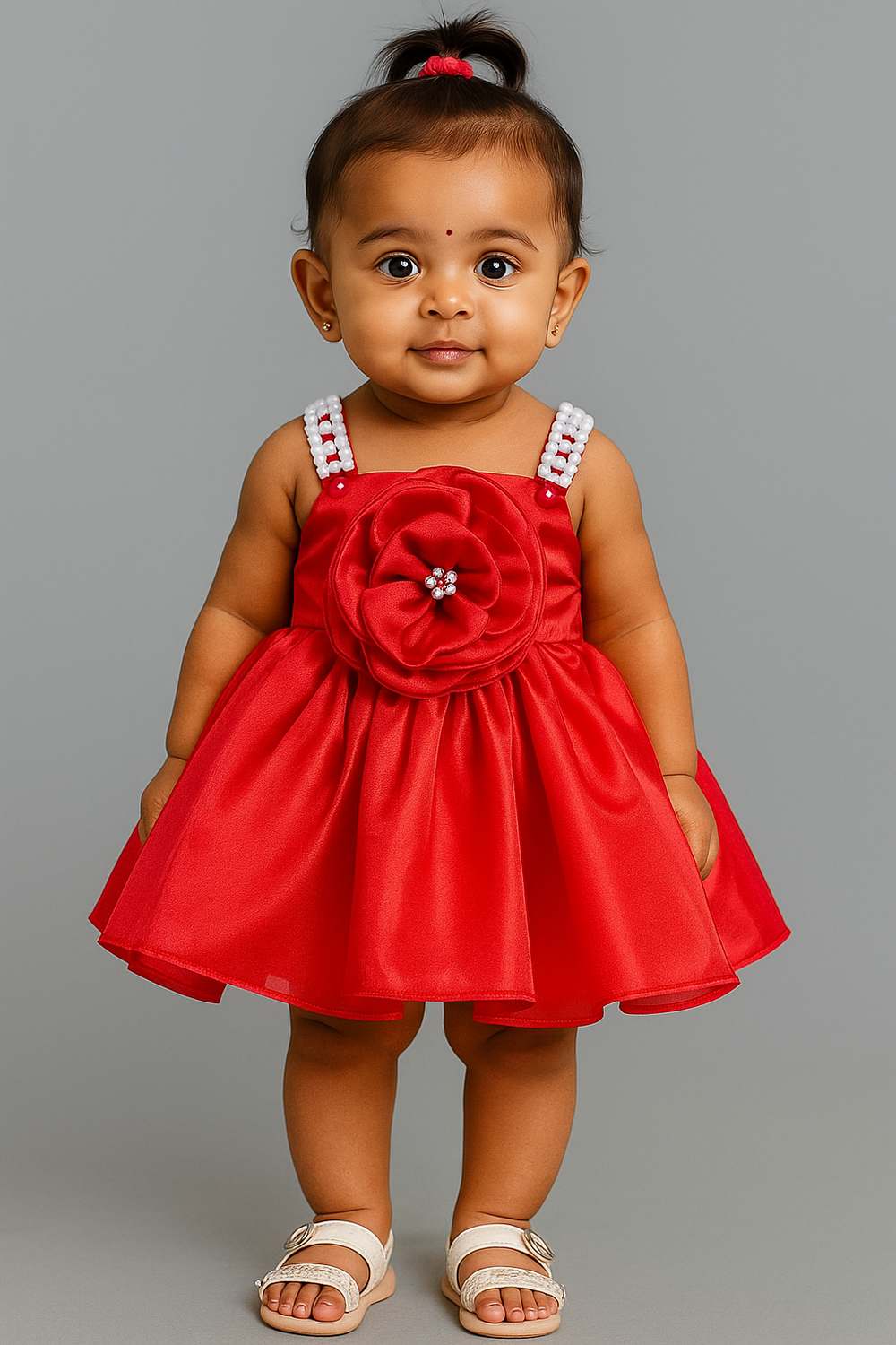 Bold and beautiful, this red dress features pearl bead straps and a large rosette in front. Designed to make your little one shine at any event.