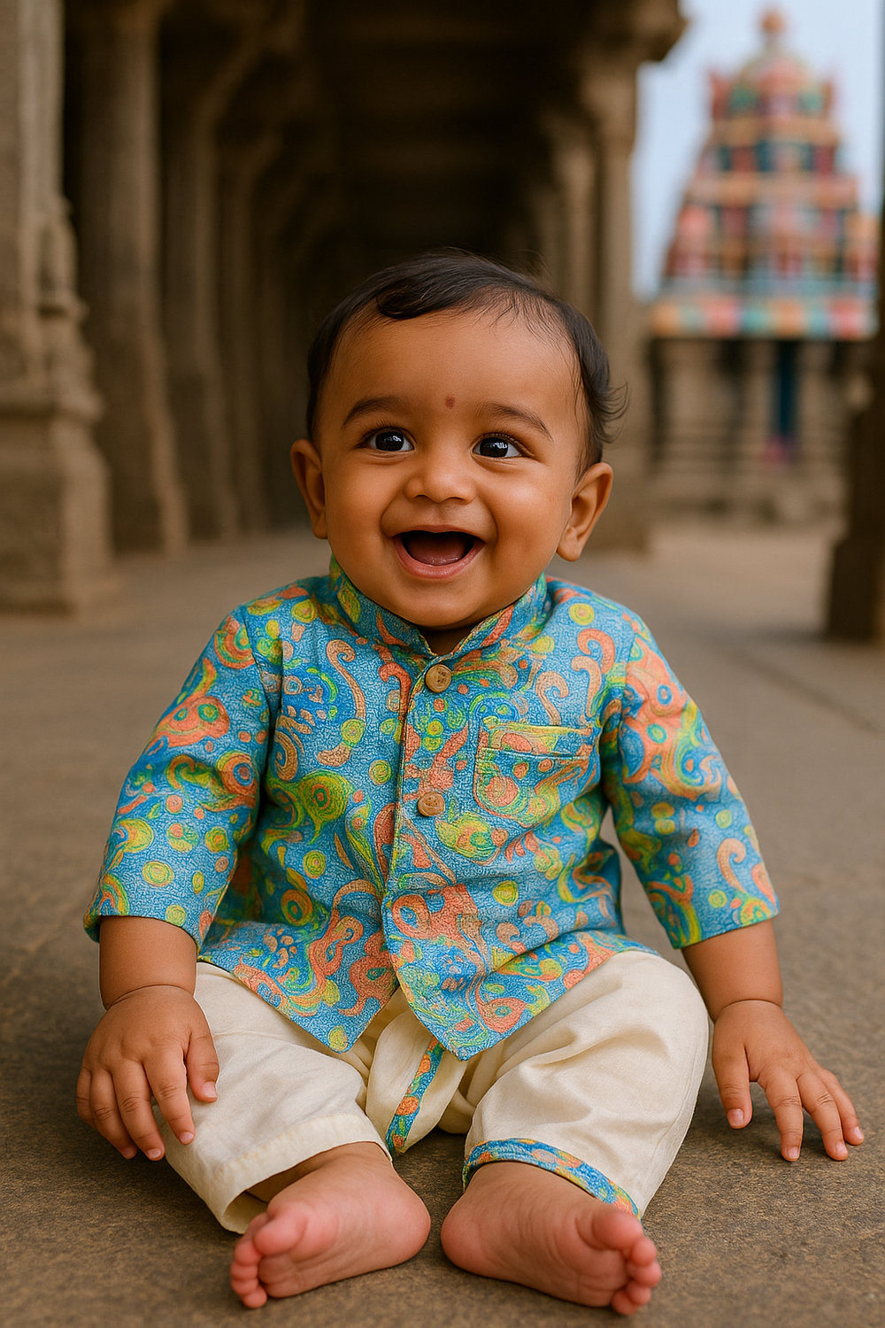 Bring out the royal charm in your little one with our Regal Peacock Blue Baby Boys Kurta Set, thoughtfully crafted for babies aged 6 months to 2 years. Inspired by South Indian heritage, this outfit beautifully combines tradition, comfort, and vibrant colors—making it the perfect choice for temple visits, weddings, cultural events, and milestone celebrations.