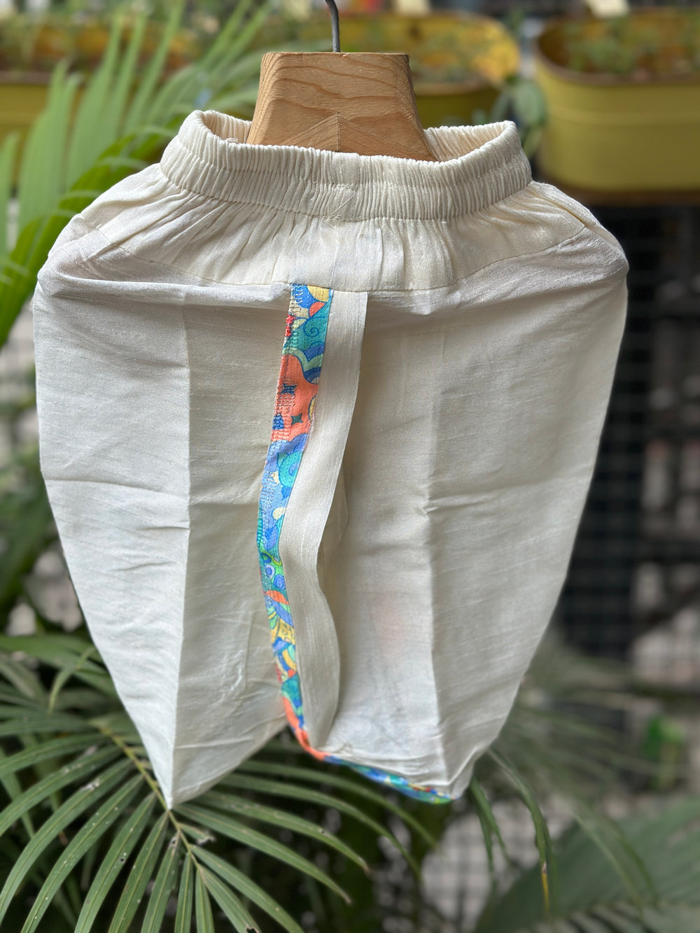 Traditional Dhoti Pants: Ivory silk-finish bottoms with matching contrast border for an authentic touch.