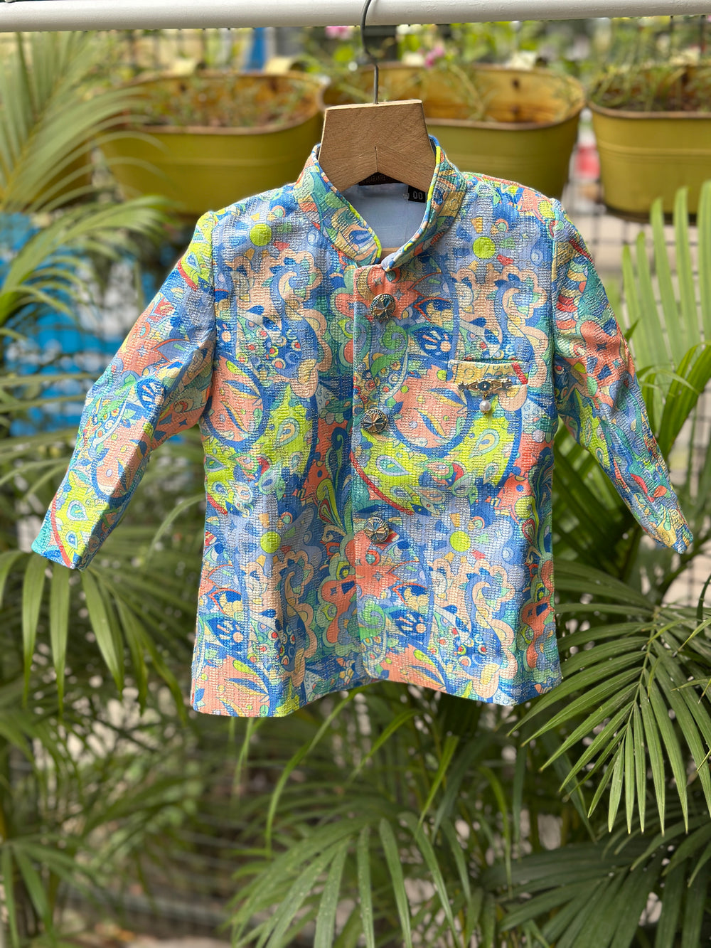 Crafted with love and care, this set blends ethnic elegance with everyday comfort. The vibrant kurta paired with ivory dhoti gives your little prince a regal look that stands out in every photograph—turning special moments into cherished memories.