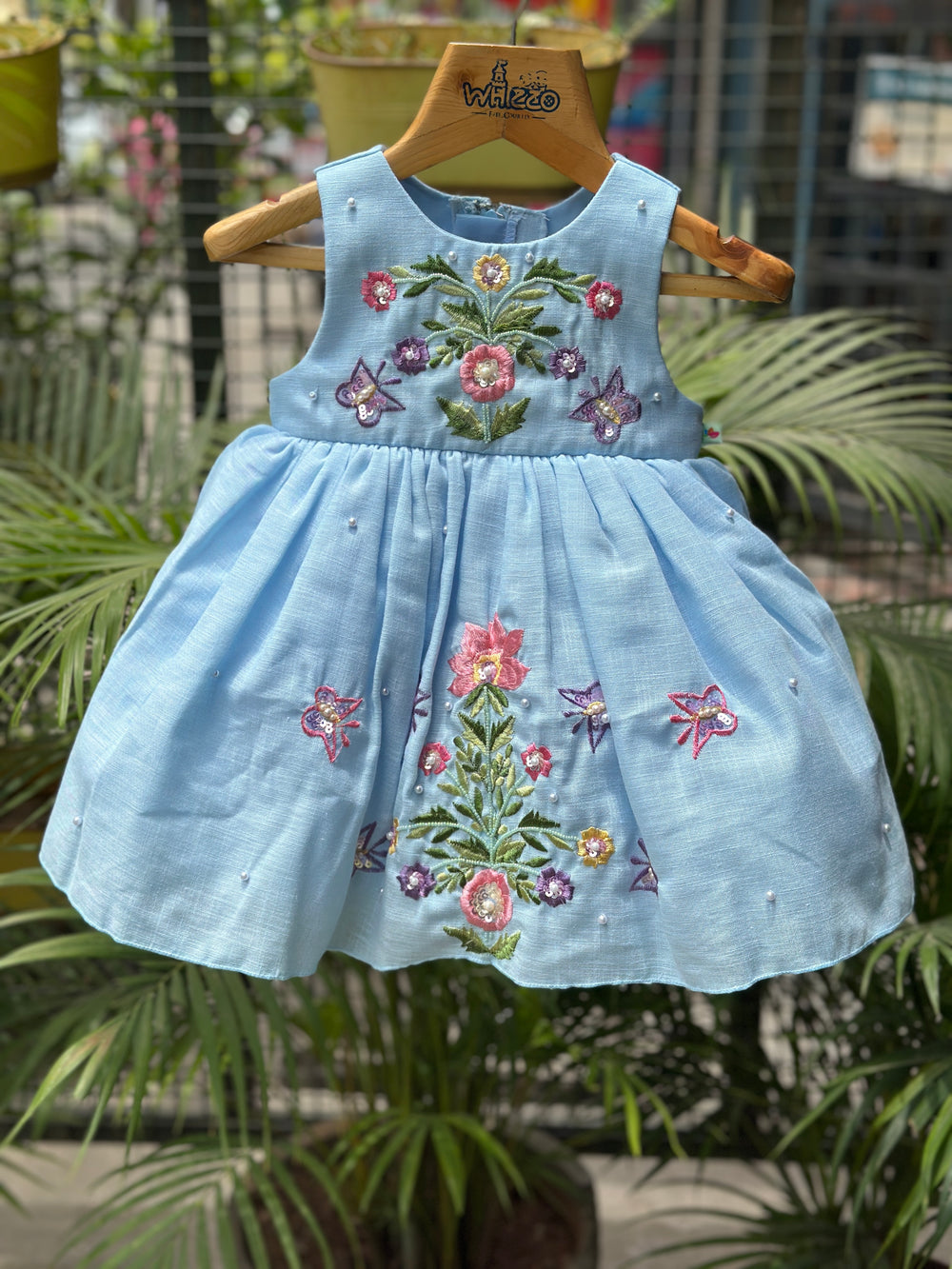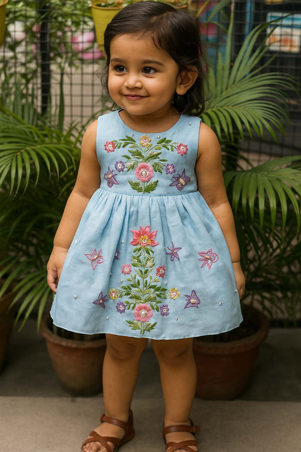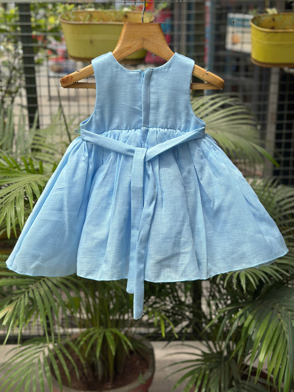 A beautiful sky blue sleeveless dress with colorful floral embroidery. Ideal for casual gatherings and photoshoots.