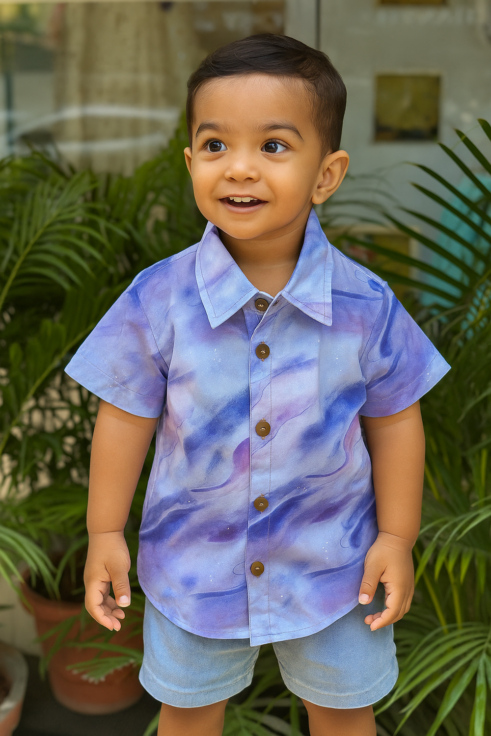 Crafted from 100% soft, breathable cotton, this shirt features a soothing blend of lavender, blue, and white tones that mimic a serene evening sky. Designed for kids aged 6 months to 6 years, it’s perfect for both casual outings and special occasions. The classic collar and wooden buttons bring a polished yet comfortable look, making it a versatile choice for any event.